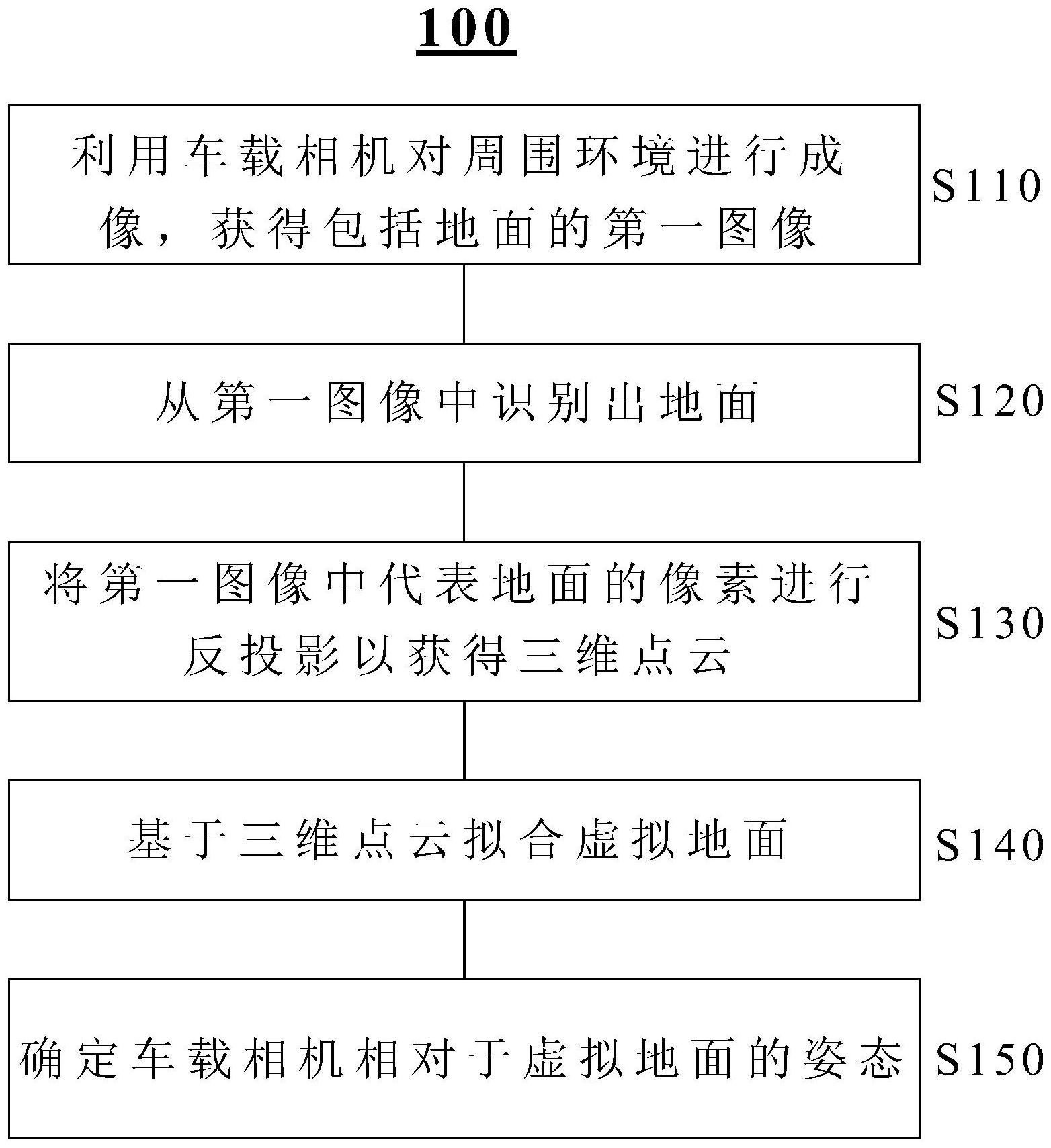 本申请涉及确定车载相机的姿态的方法、装置和电子设备。根据一实施例,一种用于确定车载相机的姿态的方法可包括:成像步骤,其利用所述车载相机对车辆周围的环境进行成像,获得第一图像,所述第一图像包括地面图像;图像识别步骤,其从所述第一图像中识别出所述地面图像;反投影步骤,其利用所述地面图像的像素的坐标值和深度值,将所述地面图像的像素反投影为三维坐标系中的点云;拟合步骤,其基于所述点云拟合一虚拟地面;以及姿态确定步骤,其确定所述车载相机相对于所述虚拟地面的姿态。本发明的方法可以在线进行相机姿态标定,而且可以自动进行,而不需要人工干预,因此非常便于实际应用。