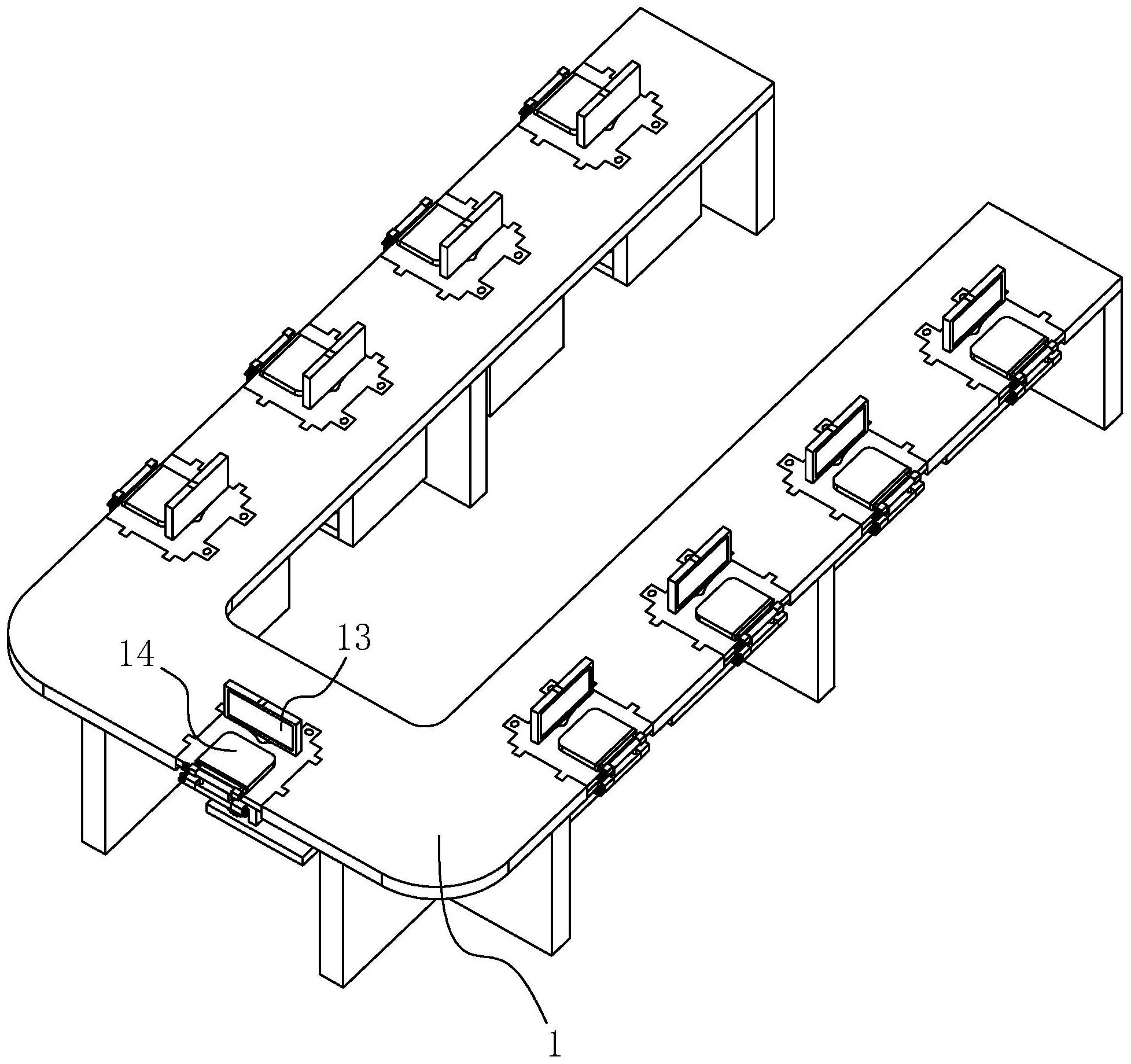 本发明公开了一种智能化U型会议桌,属于会议桌领域,其包括U型桌身,U型桌身设置有多个显示屏和触摸屏,显示屏和触摸屏数量相同并且一一对应,每组显示屏和触摸屏均连接有控制系统,控制系统包括采集用户的眼球活动的眼部活动采集模块、存储有显示屏和触摸屏的相对位置信息的位置存储模块,控制显示屏亮度的显示控制模块,控制触摸屏亮度的平板控制模块,本发明具有根据用户眼球活动来调节显示屏和触摸屏的亮度,来提高用户的眼部舒适度的效果。