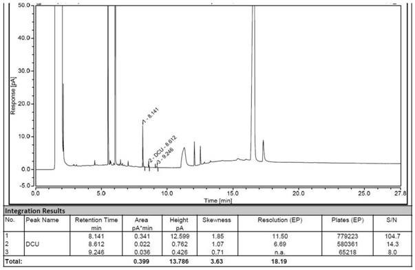 本发明涉及一种吲达帕胺原料药中DCU的检测方法。其是利用气相色谱对吲达帕胺原料药中DCU进行检测,包括以下步骤:(1)配制吲达帕胺原料药供试品溶液;(2)配制DCU的对照品溶液;(3)进样,按以下条件对步骤(1)供试品溶液和步骤(2)中的对照品溶液分别进行检测:色谱条件:固定相为100%聚二甲基硅氧烷的毛细管柱,规格:30m×0.25mm×0.25μm,载气为惰性气体,进样口温度为310‑350℃,检测器温度为330℃,分流比为1‑50:1,初始柱流速为1.0‑2.0ml/min,升温程序为:初始温度45‑80℃,保持2min,以25‑70℃/min的速率升温至230℃,保持5min,再继续以40℃/min的速率升温至280℃,保持15min。本发明使用的试剂毒性小,杂质干扰少,检测方法可靠稳定,对吲达帕胺原料药的质量控制具有重要意义。