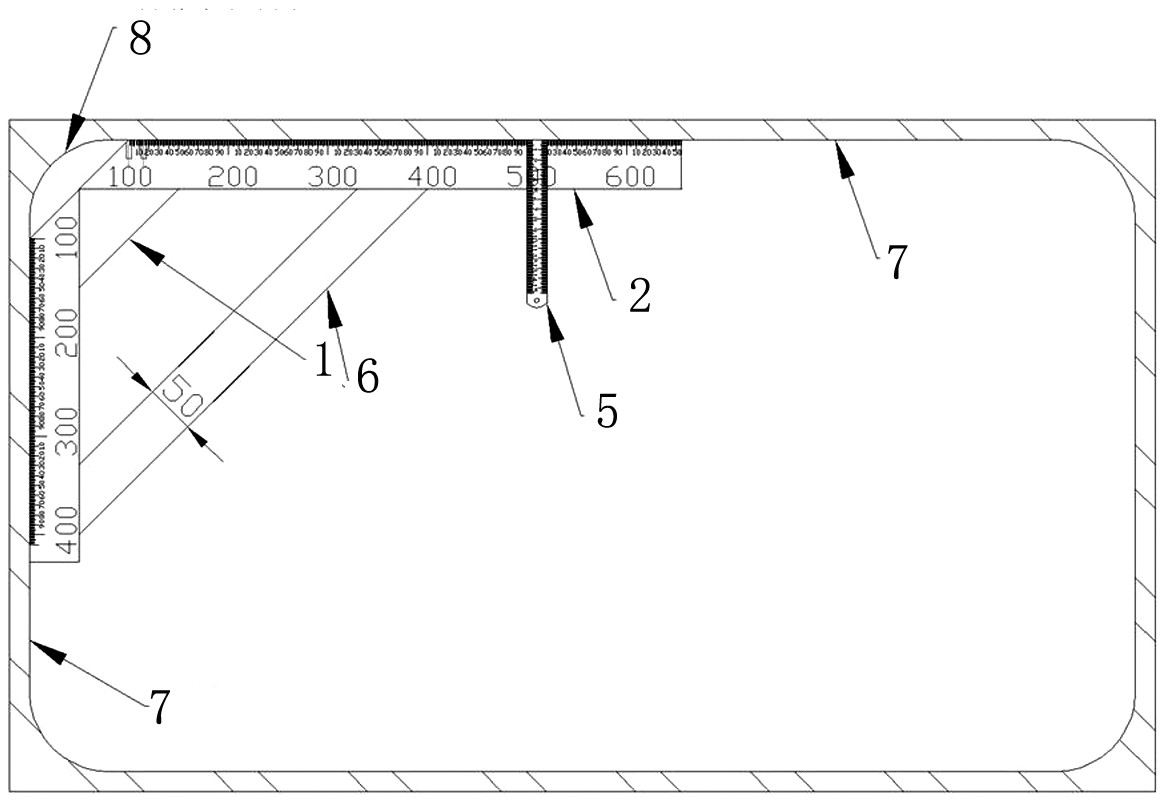 本实用新型涉及一种新型铝用炭阳极模箱垂直度检测仪,所述等腰直角三角形连接板的第一直角边上固定有第一测量主尺,所述等腰直角三角形连接板的第二直角边上固定有第二测量主尺,第一测量主尺靠近三角形连接板的一端与三角形连接板的直角顶点之间具有预设距离A,第二测量主尺靠近三角形连接板的一端与三角形连接板的直角顶点之间具有预设距离B,所述第一测量主尺上设置有一测量副尺轨道,所述测量副尺与测量副尺轨道滑动连接。本实用新型具有以下有益效果:可以消除模箱内部侧面倒角带来的测量障碍,顺利的将该测量器具与基准面贴合,结合副尺的配合,带入能够顺利的获得偏差数据,并且可以满足单人测量。
