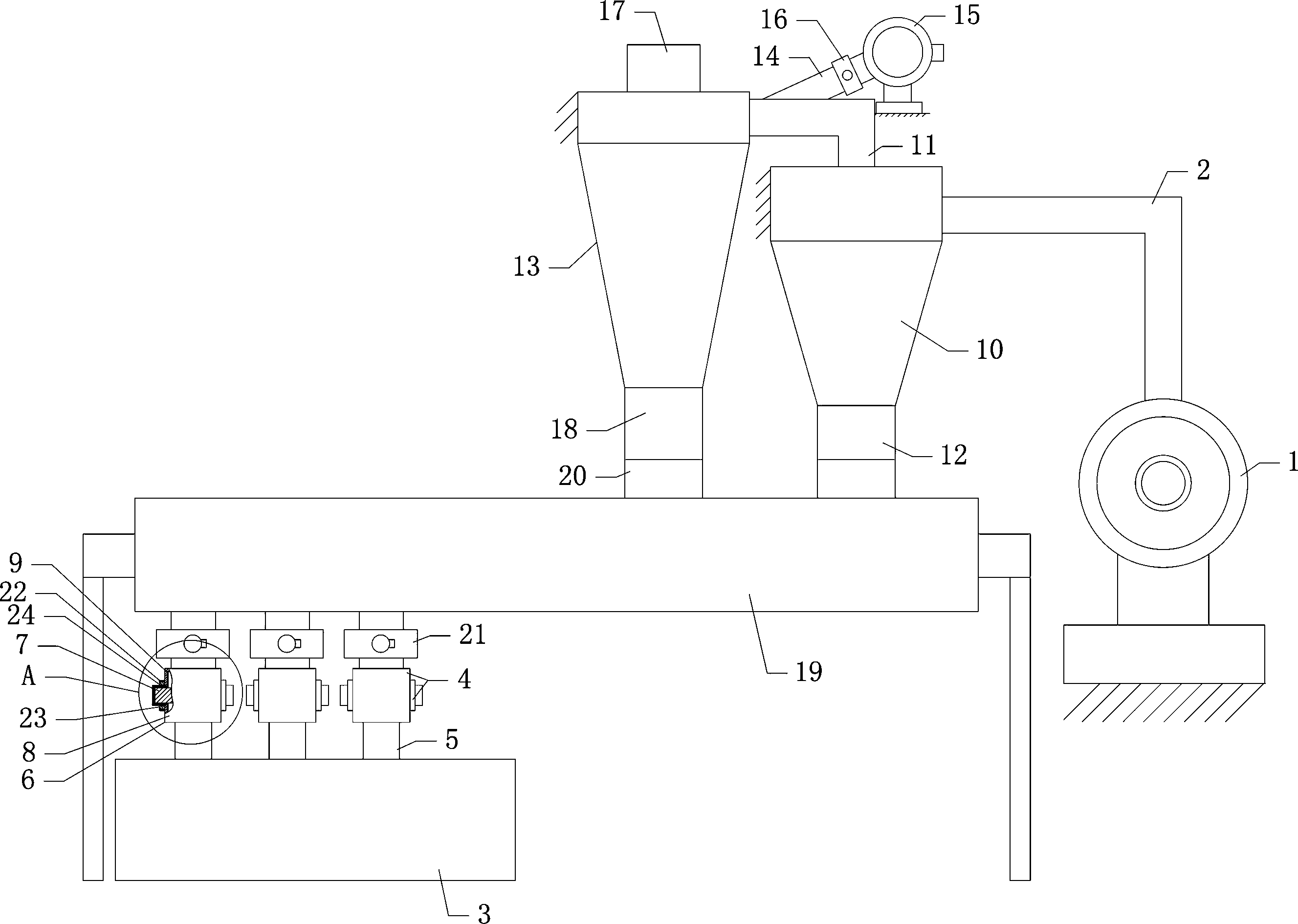 本实用新型涉及电厂燃煤锅炉输灰设备领域,尤其是燃煤锅炉输灰装置,包括一通过进料口与外部总机的锅炉除尘器相连通的鼓风机,所述鼓风机的出口通过管道连接一灰尘分离装置,在灰尘分离装置的底部设有一输料装置,在输料装置的底部连通设有若干个灰尘导出装置,在各灰尘导出装置的底部设有一灰尘收集箱;所述各灰尘导出装置分别通过灰尘导料管与所述灰尘收集箱相连通;所述灰尘导出装置包括一锁气器,在锁气器的底部设有所述的灰尘导料管,所述锁气器包括一锁气器主体,在锁气器主体设有一转子;在壳体内壁上固定连接一衬套壳。它结构设计合理,操作简单,维修更换方便,维修操作安全,更有效地满足了人们的需求。