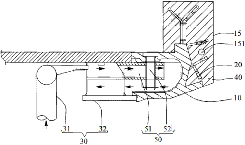本实用新型涉及一种窑口防护装置,包括一第一防护组件,以及分别设于第一防护组件相对两侧的第二防护组件及第三防护组件,第一防护组件包括一固定板及通过弧形板与固定板连接的承载板,固定板与弧形板的连接处设有一朝远离固定板方向延伸的延长板,第二防护装置包括至少一设于延长板顶部及靠近弧形板一侧的第一抓钉及第二抓钉,以及与弧形板侧表面固定连接的第三抓钉,第三防护组件包括一冷却风机与冷却风机出风口连接的冷却环,冷却环的另一端与紧固件连接,紧固件包括一固定座及紧固螺栓,固定座为中空结构,固定座的底部与承载板的内壁形成一与冷却环出风口连通的出风孔。由于该窑口防护装置性能可靠且使用寿命长,满足了实际应用需求。