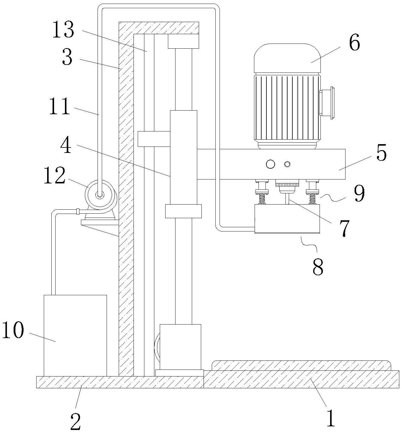本实用新型属于木材加工设备技术领域,尤其为一种木材加工用钻孔装置,包括工作台、基座、支撑架、升降机构、升降板、驱动电机、钻头、碎屑收集构件和自适应调整装置,其中,所述基座连接于工作台的一侧,所述支撑架固定安装于基座的顶部。本实用新型能够对钻孔加工过程中产生的木碎屑进行集中收集,防止碎屑散落至工作台上,保证台面清洁,无需人工频繁清洁,同时利用碎屑收集构件笼罩钻头,有效避免由于钻头裸露导致在加工过程中发生工作人员误触钻头的事故,使用安全性较高,能够使碎屑收集构件始终处于钻孔工位外围,对溅射以及散落至木材孔位外围的碎屑进行集中收集,保证了装置的稳定性和可靠性,能够适应不同尺寸的木材钻孔加工需求。