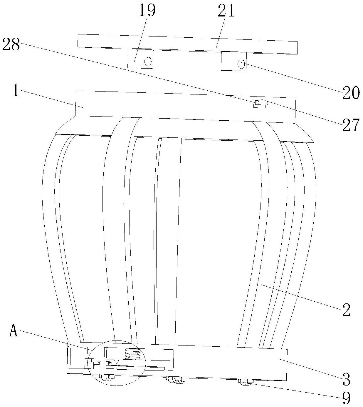 本实用新型属于家具相关技术领域,尤其为一种便于移动的鼓凳,包括凳板,所述凳板的底部固定连接有支撑杆,所述支撑杆的一端固定连接有底座,所述底座的内顶壁固定连接有伸缩杆,所述伸缩杆的外表面套接有复位弹簧。本实用新型通过伸缩杆、复位弹簧、放置板、梯形块、万向轮、推板和连接块相配合,实现卡板与卡槽的分离和结合,完成万向轮的升降使用,增加鼓凳的实用性和便捷性,利用滚轮可以减小摩擦力,更方便卡板与卡槽的插接,提高了鼓凳移动的快捷性,减小工作人员的体力付出,解决现有的鼓凳不具有便于移动的功能,使用时需要人们搬动,增加了使用人员的体力付出,使用率低下的问题。