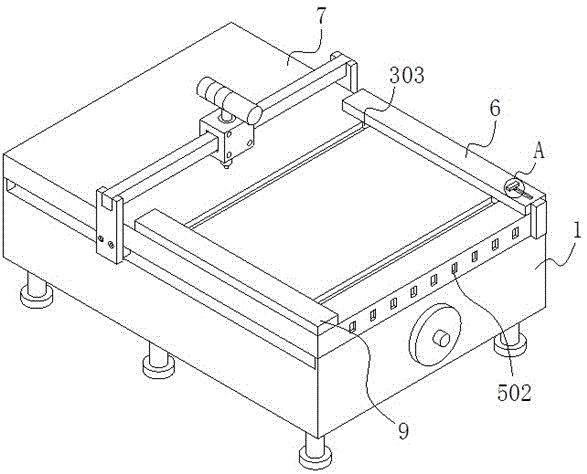 本实用新型公开了一种家私加工用裁切装置,包括装置本体,所述装置本体的顶部固定连接有顶板,所述顶板顶部的左侧固定连接有第一引正板,所述顶板顶部的右侧活动连接有与第一引正板配合使用的第二引正板,所述第二引正板底部的前侧和后侧均固定连接有滑动机构,所述第二引正板内壁的前侧活动连接有拉动机构,所述拉动机构的顶部固定连接有传动机构。本实用新型通过设置装置本体、传动机构、滑动机构、拉动机构、定位机构、第二引正板、顶板、通口、第一引正板、滑块和滑槽的配合使用,解决了现有的家私加工用裁切装置不具备对裁剪物进行引正导向,裁剪物在裁剪时容易发生偏斜,影响家私的加工效率的问题。
