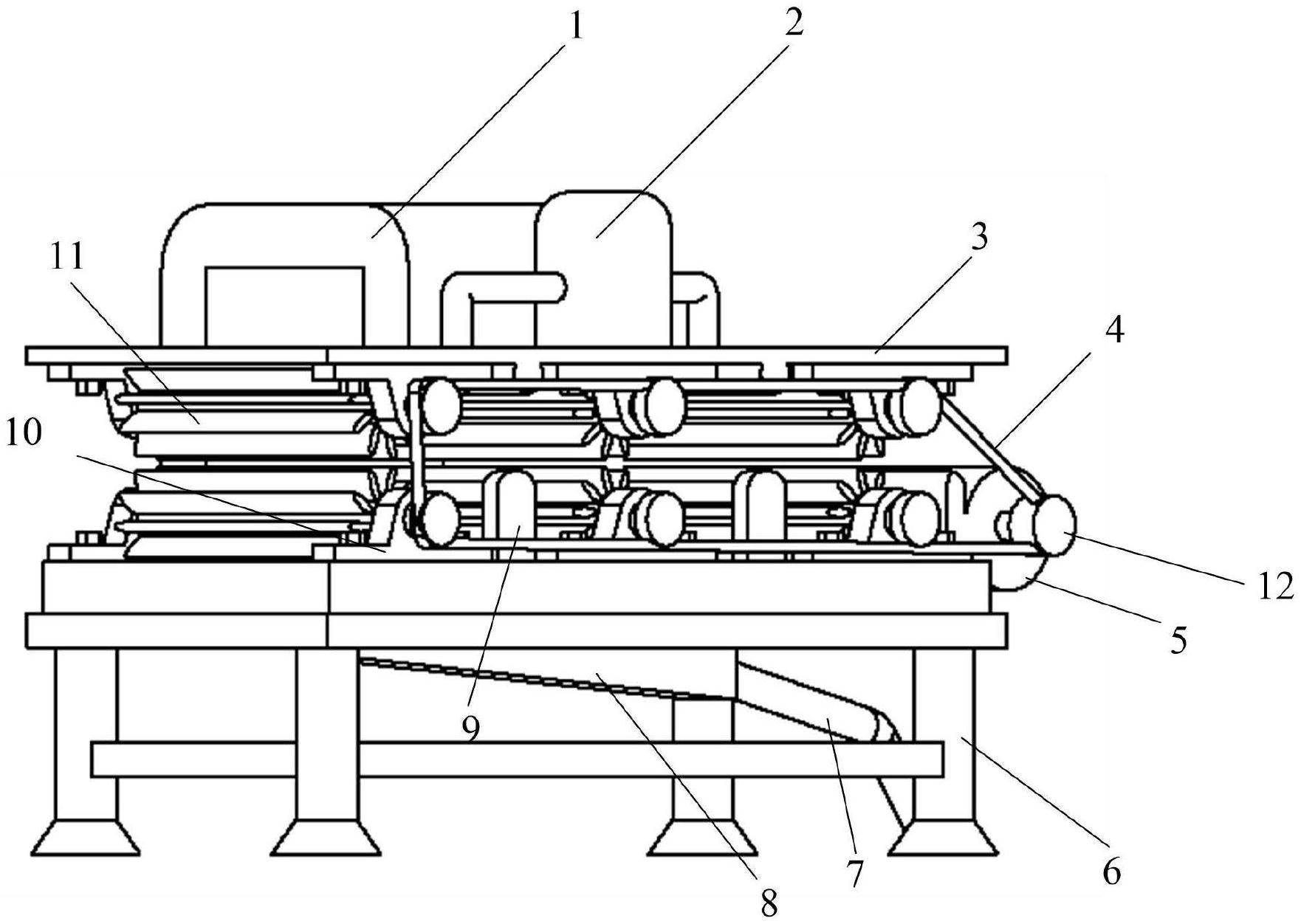 本实用新型公开了一种家具板材清洁装置,包括支板,洒水系统,顶板,传动带,电机,支架体,废水管,集水槽,板材支撑架,带座轴承,清洗辊和电机带轮,本实用新型,撒水系统固定安装在顶板上,顶板通过支板与支架体固定,电机固定安装在支架体的一侧,清洗辊和带座轴承活动连接,带座轴承设置为多个,且带座轴承通过六角螺栓固定在顶板的下方和支架体的上方,集水槽设置在支架体的下方,废水管连接在集水槽的一侧,传动带连接与电机带轮和清洗辊带轮,板材支撑架采用多个设置在支架体上。
