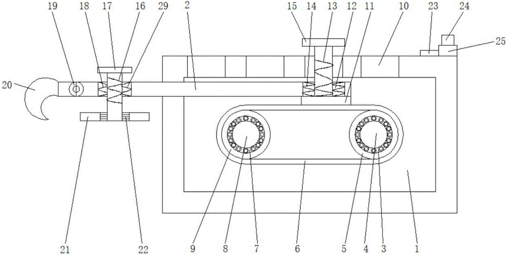 本实用新型公开了一种新型省力撬取式铁钩,包括翘取盒,所述翘取盒内部右侧上下两端均固定安装有第一轴承,两个所述第一轴承内侧壁之间贯穿安装有第一随动杆,所述第一随动杆中端表面固定安装有第一滚动桶,所述第一随动杆上端表面镶嵌安装有随动齿轮。本实用新型由于可以通过转动电机带动第一随动杆进行转动,使第一滚动桶带动传送皮带和第二滚动桶进行转动,进而使固定在传送皮带表面的滑动杆向前或者向后移动,可以调节滑动杆在翘取盒内部的长度,使整个装置的长度增加或者减少,进而调节翘取钩的位置,使不同身高的使用者不必弯腰去拉动相应的待翘取的物品,保护使用者的身体健康,较为实用,适合广泛推广与使用。