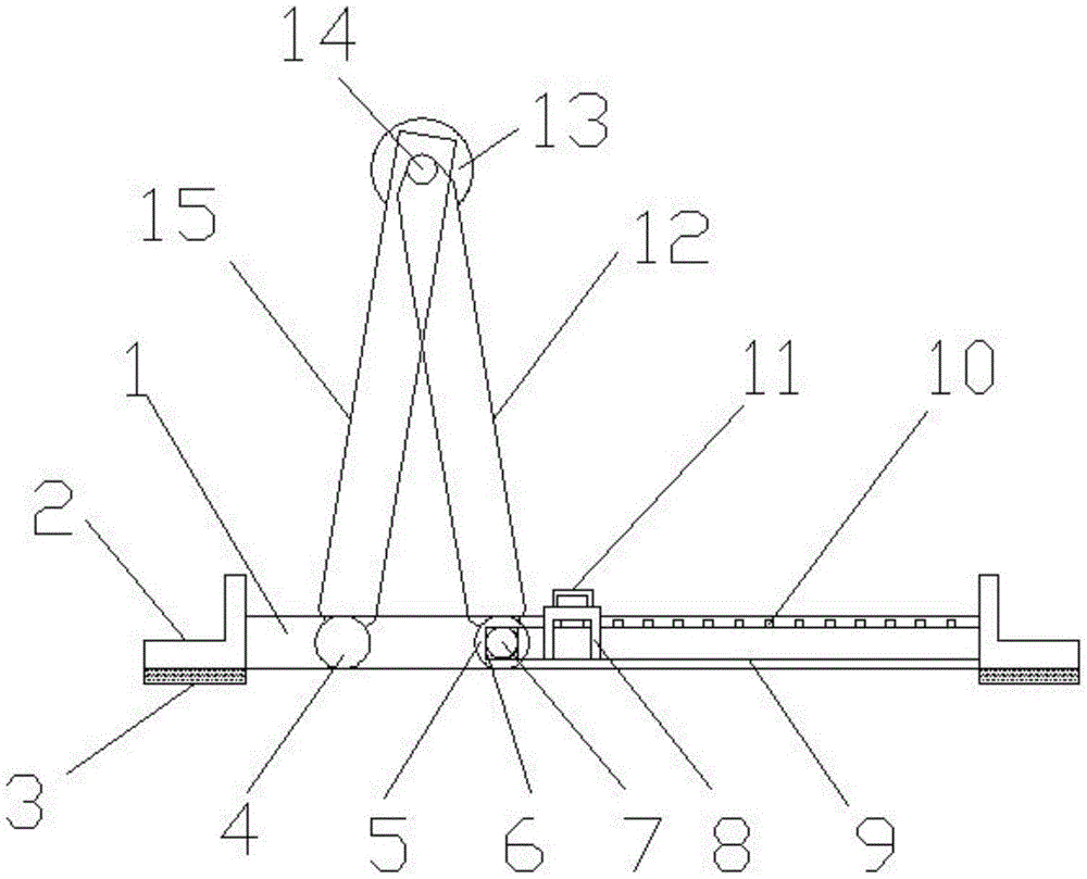 本实用新型公开了线条抛光机折叠延伸架,包括底座和两个插块;所述底座的顶侧呈开口状,所述底座内部的左侧设置有转轴a且转轴a的前后两端分别贯穿于底座的前后两侧,所述转轴a的顶端固定安装有支杆a,所述支杆a的右侧呈开口状,所述支杆a内部的顶侧设置有转轴b,所述转轴b的前后两端分别贯穿于支杆a的前后两侧。本实用新型通过设置的两个插块与若干卡块配合使用,便于根据抛光机工作台的高度,以转轴b为基点,调整支杆a和支杆b之间的夹角,然后再通过两个插块将两个滑块限制在相应的两个卡块上,从而限制住支杆b的位置,使支杆a的顶部与工作台保持水平,从而使得本装置作为工作台的延伸使用,较为实用,适合广泛推广和使用。