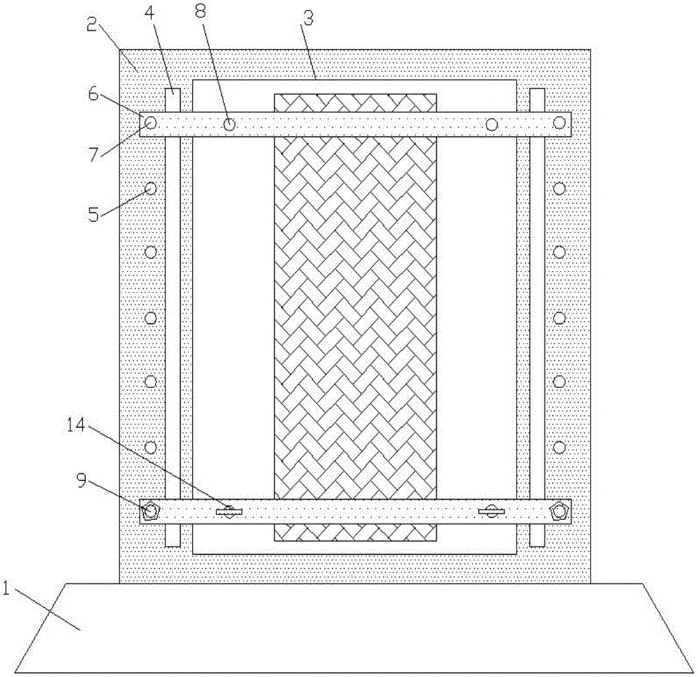 本实用新型公开了一种新型的可拆卸石材展示架,包括固定台、石材板和导杆;所述固定台为钢材料制成,所述固定台的上表面中部竖直焊接有展示架,所述展示架的前侧中部开设有放置槽,所述展示架前侧左端和右端竖直对称开设有限位槽。本实用新型把石材板竖直放置在放置槽内,平稳的推动调节板在展示架的前侧上下移动,推动展示架下方的调节板移动至放置槽的底侧,通过螺栓贯穿第一固定孔和第二固定孔对调节板进行固定,通过内螺纹与外螺纹螺旋连接,顺时针转动把手,经导杆能够带动推板往后移动,进一步对放置槽内的石材板进行固定,在需要拆卸石材板时,按照相反的步骤逆时针转动把手,拆除螺栓,即可移走调节板,方便取下石材板。