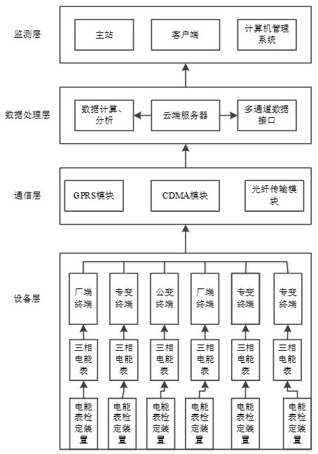 本发明公开一种大数据、云环境下电能表错误接线的检测系统及方法,涉及电能计量检测技术领域,构建出设备层、通信层、数据处理层和监测层的系统体系,利用云大数据管理平台实现对电能表错误接线情况下输出的各种数据的分类、计算、存储和数据传递,实现了电能表远程、在线、实时监控。本发明通过构建标准数据库,实现电能表故障接线数据类型、档案错误数据类型、过压检测数据类型、表计损坏运行数据或者无功补偿数据等多种数据的分析,有效地实现CT二次短路、CT二次开路、正负极性反接、PT一、二次断相、电压错相、电流错相或表尾电流进出反接情况下的数据输出分析,通过利用多种算法模型,实现不同的计算需求,满足数据分析的多种需要。