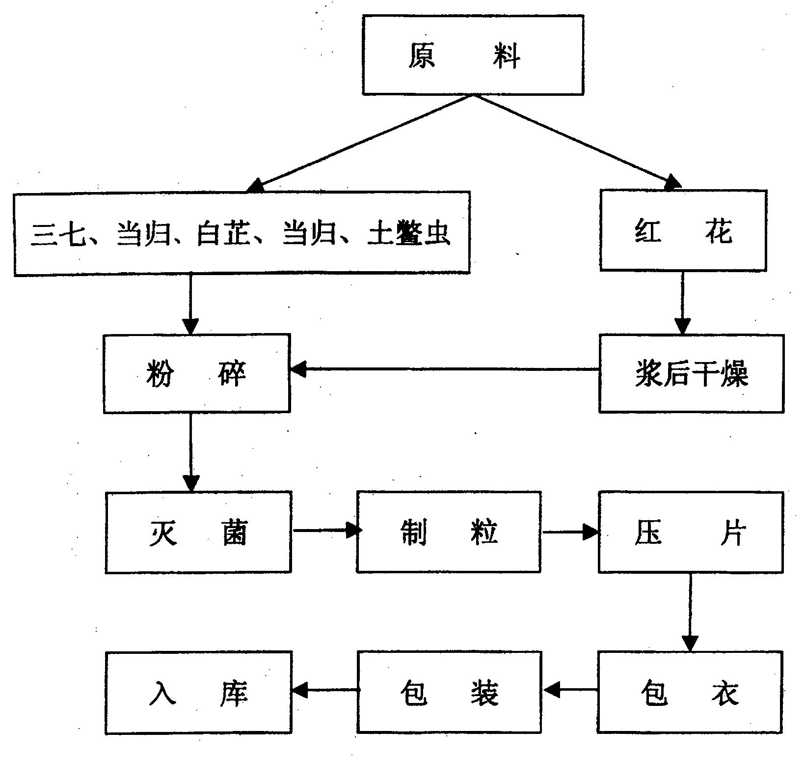 本发明公开了一种红药薄膜衣片及其制备工艺,它包括下述原料三七、川芎、白芷、当归、土鳖虫、红花,在原料的基础上加入辅料使其硬度大于3.0kg,辅料包括以下成分,按重量与红花的比为,微晶纤维素∶硫酸钙∶糊精∶红花=(80-120)∶(20-40)∶(40-80)∶175;其制备工艺如下:粉碎、制粒、压片、包衣,其中包衣包括:包衣液的制备、基片的预热,喷射即得剂型为:片重为0.26g/片,薄膜衣为红色的红药薄膜衣片。包衣工艺时间短,操作简便,干燥速度快,药物受湿热影响较小,提高了药品质量;节约包装材料,减少了患者服药量;经薄膜包衣后药品能达到抗湿、抗热的要求,可延长和提高产品的寿命;减少了红药片的含糖量,糖尿病人也可以服用。