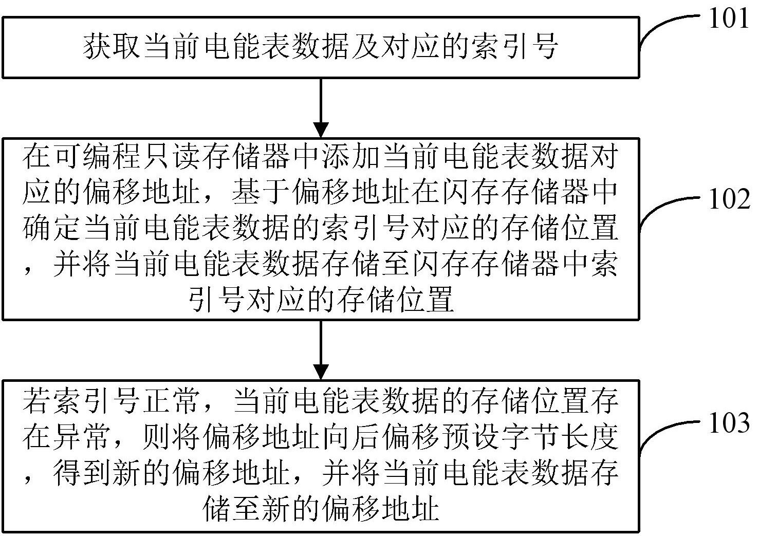 本申请提供一种电能表数据存储方法、装置、终端及存储介质。该方法包括:获取当前电能表数据及对应的索引号;在可编程只读存储器中添加当前电能表数据对应的偏移地址,基于偏移地址在闪存存储器中确定当前电能表数据的索引号对应的存储位置,并将当前电能表数据存储至闪存存储器中索引号对应的存储位置;若索引号正常,当前电能表数据的存储位置存在异常,则将偏移地址向后偏移预设字节长度,得到新的偏移地址,并将当前电能表数据存储至新的偏移地址。本申请能够实现对存储失败或者错误的电能表数据的恢复和重新存储,提高电能表数据的存储有效率和准确率。