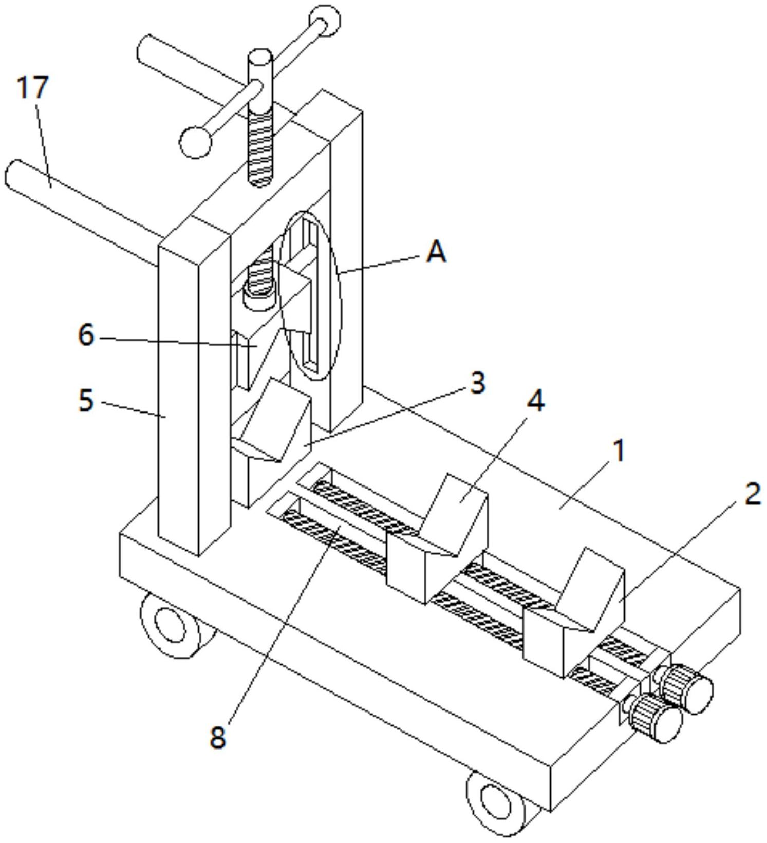 本实用新型公开了一种薄膜加工用圆辊输送装置,包括有平板车,平板车上自前而后依次设有同中心线的二个活动支撑块和固定支撑块,二个活动支撑块和固定支撑块的顶端均设有V形槽,二个活动支撑块相对固定支撑块的距离可调;平板车的后侧固定有冂形支架,冂形支架的两侧立柱分别对应位于固定支撑块两侧,冂形支架的两侧立柱之间安装有压块,压块的底端设有倒V形槽,压块相对固定支撑块的距离可调。本实用新型能够为圆辊提供三点支撑,其中两个支撑点的位置可进行调节,能够对圆辊的一端实施压紧,将其固定于平板车上且不会掉落,无需通过增长平板车来适应较长的圆辊,不会造成操作不便,并能够满足对一系列不同直径的圆辊进行支撑和压紧的需要。