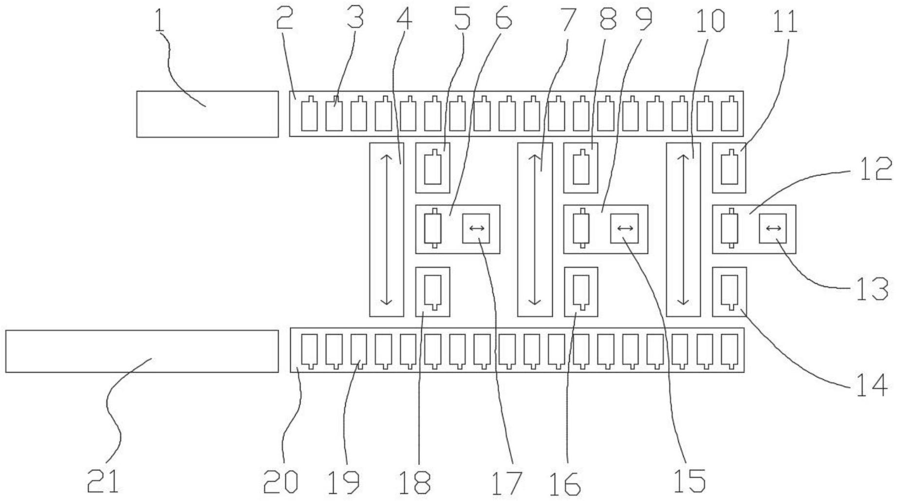 本实用新型提供了一种复合正极的制袋式叠片电芯及生产设备,属于动力电池领域,设备包括负极制片机构、正极复合制片系统、输送机构、叠片转运机构、叠片系统和隔离膜包覆机构;制袋式叠片电芯包括按照负极‑正极‑负极……正极‑负极顺序堆叠的负极片料和正极复合制袋式单元片料,以及外围包覆的隔离膜;本申请可以有效解决大尺寸长电芯高速情况下隔离膜褶皱问题,提升产品合格率,降低设备采购、能源消耗、维护等成本,从而降低锂离子电池的生产成本,可在电池制造领域推广应用。