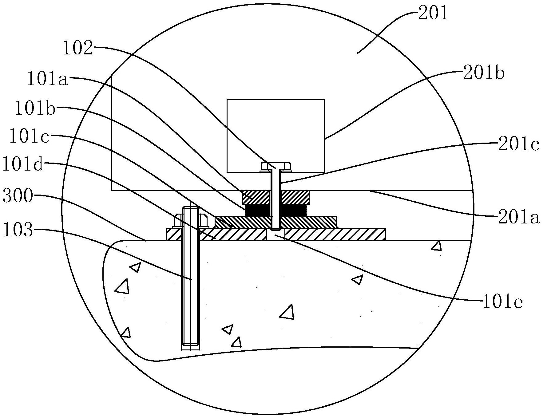 本申请提供了一种地脚组件,所述的地脚组件包括若干个板件及第一紧固件;所述若干个板件依次层叠设置,所述若干个板件供于设置在支撑地面和设备主体的底面之间而支撑所述设备主体,所述若干个板件至少包括一个供于固定在所述支撑地面的地脚板件和一个具有弹性的调整板件;所述第一紧固件沿所述若干个板件的层叠方向穿设于所述若干个板件,所述第一紧固件的一端供于连接所述设备主体、与一端相对的另一端穿设于所述地脚板件。由于调整板件具有弹性,调整板件层叠于地脚板件的上方,调整板件能够吸收设备主体在运行过程中所产生的震动,起到缓冲震动的作用,从设备主体的整体而言,调整板件能够及时调整设备主体整机的水平度。