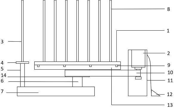 本实用新型专利公开了一种自动包捆薄膜设备,包括插盘和电机;所述插盘为圆形,所述插盘顶部设有插杆,所述插盘底部设有插头,所述插盘下方设有底盘,所述底盘上设有与插头对应的插口,所述底盘底部设有轴承,所述轴承外套有皮带,所述皮带与电机相连,所述轴承还与支柱相连,所述支柱底部与底座相连,所述底座一侧还设有支杆。与现有技术相比,本实用新型的有益效果是:第一,设计简单,成本低,易于实现;第二,包捆效率高,操作简单,劳动强度低。