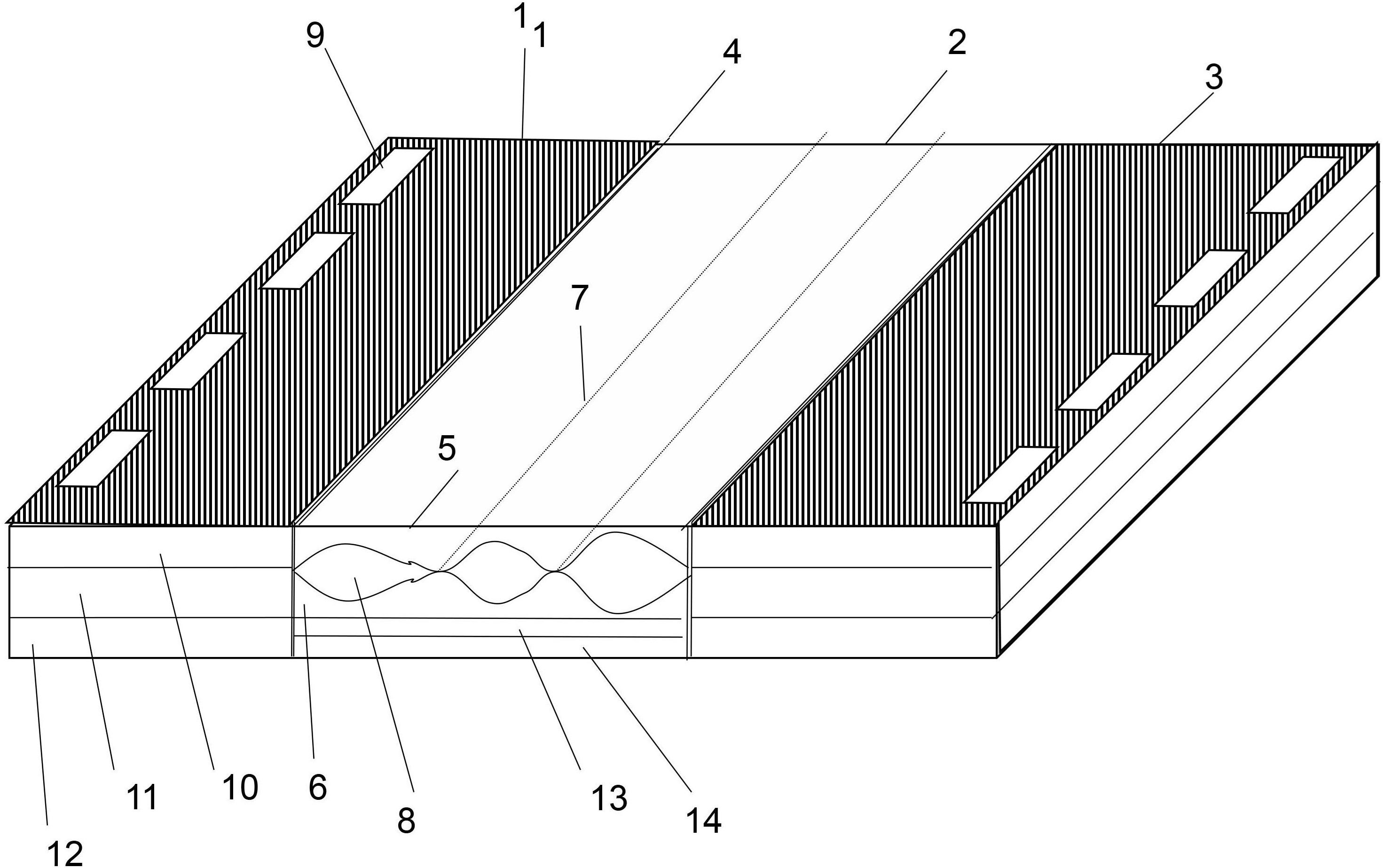 本实用新型提供了一种双色农用地膜,包括左侧地膜、中间地膜和右侧地膜,所述左侧底地膜与中间地膜之间及所述中间地膜与右侧地膜之间均设有密封热压线,所述左侧地膜和右侧地膜为黑色,所述中间地膜为透明薄膜。本实用新型通过填土或固定孔方式固定,双色地膜一方面可抑制杂草生长,一方面可促进根系生长,提高低温,减少灰霉病发生且材料可降解,安全实用。