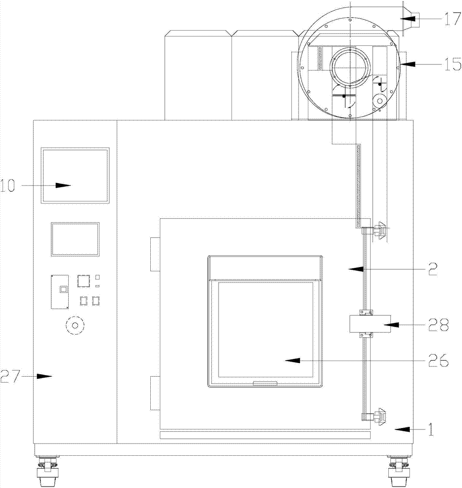 本实用新型涉及一种自动控温控湿烘干箱,包括箱体,箱体前端面上设有箱门,箱门与箱体之间密封连接,箱体内设有工作室和加热室,加热室设置在工作室上方,加热室内装设有加热器,加热室一侧安装有变频风机,变频风机水平布置,变频风机安装在箱体的侧壁上,变频风机的输出轴上安装有叶轮,叶轮设于加热室内,工作室后部设置有加湿系统,工作室内底部设置有样品篮,工作室左右两侧分别设有风道,箱体内工作室、加热室以及左右两侧的风道构成风循环通道,加热器、变频风机分别通过线路连接控制器;本实用新型能够使得箱内空气得到充分流动,保证箱内温度在设定范围内,实现了精确除湿、节能降耗的效果,确保被烘烤的饲料等更快更好更均匀地烘干。