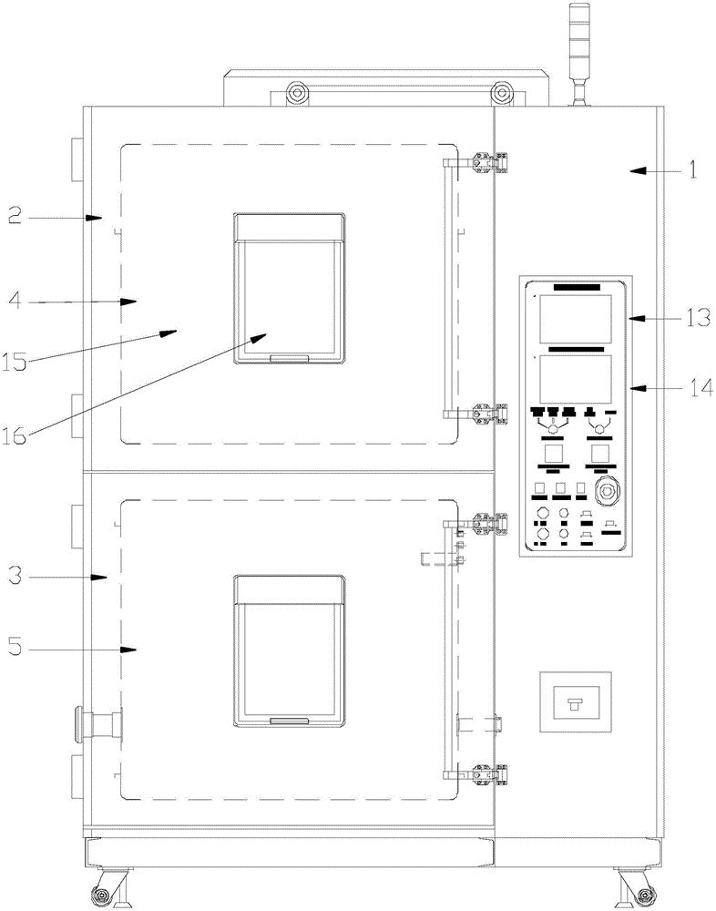 本实用新型涉及一种快速温变试验箱,包括箱体,箱体内分为上下布置的热箱和冷箱,热箱内设有高温槽,高温槽内装设有高温加热器,冷箱内设有低温槽,低温槽内设有蒸发器,蒸发器与冷冻机组相连,冷冻机组包括加湿器、压缩机和水冷凝器,加湿器、压缩机设置在冷箱后侧,水冷凝器设置在热箱后侧,热箱与冷箱之间装设有样品提篮,样品提篮的上端部装设有吊环,吊环通过绳索连接提拉气缸的活塞端,提拉气缸安装在箱体顶部,样品提篮在提拉气缸与绳索的带动下做上下移动,样品提篮处设置有移动式传感器;本实用新型同现有技术相比,不仅温变范围更大,能满足更广泛的温度环境要求,而且增加了试验功能,扩大了使用范围,同时节约了使用成本。