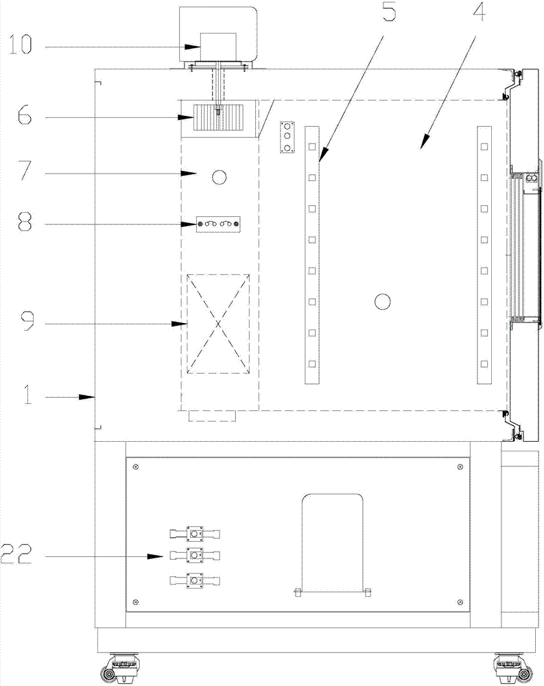 本实用新型涉及一种可控式低湿除湿试验箱,包括箱体,箱体前端面上设有箱门,箱门上安装有门把手,箱体内前部设有试验室,试验室内安装有样品架,箱体内后部自上而下依次设有循环风叶、蒸汽管、加热器、蒸发器,循环风叶设于风机涡壳内部,循环风叶安装在循环电机的输出端,循环电机安装在箱体外顶部,蒸汽管与加湿锅炉相连,蒸发器的入口端通过管道连接冷凝器,蒸发器与冷凝器之间设有过滤器,冷凝器的入口端连接压缩机,蒸发器的出口端分别通过管道连接蒸发压力调节阀、电磁阀四,蒸发压力调节阀与电磁阀四并联设置;本实用新型实现了蒸发器长期运行不会产生结冰,同时达到了节能降耗的效果,解决了箱内空气被干燥对实验室温度产生影响的问题。