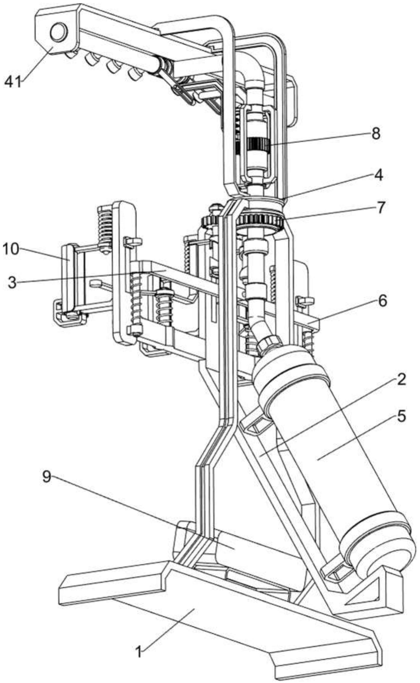 本发明涉及一种消防灭火装置,尤其涉及一种锂离子电池储能电站可分段的消防灭火装置。提供一种能够及时对火源进行扑灭,从而能够减小损失的锂离子电池储能电站可分段的消防灭火装置。一种锂离子电池储能电站可分段的消防灭火装置,底板、支撑架和连接板等,底板上侧栓接有支撑架,支撑架中部栓接有连接板。本发明通过煤油管受热炸裂使得调节阀被打开,随后能够使得二氧化碳经过喷管喷出,能够及时地对电站进行灭火处理,从而能够减小损失。