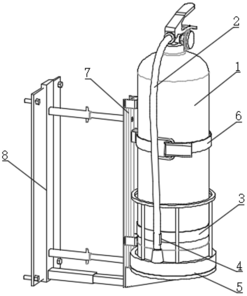 本实用新型公开了发动机舱灭火器固定结构,该发动机舱灭火器固定结构,包括灭火器和灭火管,所述灭火管固定连接于灭火器的顶部,所述灭火器的左侧设置有立柱,所述立柱远离灭火器的一侧设置有安装板,所述立柱的右侧固定连接有凸环,所述凸环远离立柱的一侧固定连接有橡胶垫,所述安装板的左侧固定连接有固定杆,所述固定杆的内部设置有活动杆,所述活动杆的外表面连接有卡接杆。该发动机舱灭火器固定结构,在未使用灭火器时,活动杆会位于固定杆的内部,不会占用太大的空间,通过拉动活动杆,当卡接杆与固定杆外表面的通孔接触时,在自身回复力的作用下,会卡接在通孔的内部,对立柱起到固定作用,方便灭火器拿出使用。