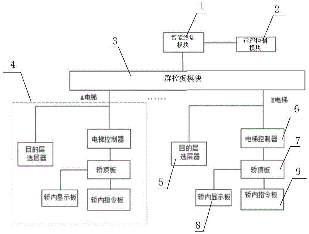 本实用新型公开了一种电梯目的层群控系统,包括:一智能终端模块;分别与智能终端模块通信连接的远程控制模块和群控板模块;其中,群控板模块还通信连接有至少2个单梯单元,以实现对各单梯单元的智能化呼梯控制。采用本实用新型的电梯目的层群控系统能够根据乘客呼梯情况智能化调度各个电梯的运行,减小环境污染、减低能源损耗同时以提高运营效率。