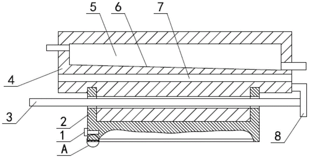 本发明涉及一种风扇叶注塑用的带冷却的注塑上模,属于注塑模具技术领域,其包括上模本体,上模本体的左下部水平设置有注塑通道,在上模本体上部设置有一块用于上模本体加热的加热铝块,在上模本体的上表面向下开设有凹槽,加热铝块的下表面向下延伸有与凹槽配合的凸块,在加热铝块内部设置有一个用于蒸汽加热的加热腔,加热腔的底表面为一左高右低的倾斜面,在加热腔下方的加热铝块中横向开设有一个冷却水腔,在注塑通道内侧壁上设置有环状结构的凸台,在注塑通道上方的上模本体上穿装有电加热棒。本发明其结构简单,其上模本体均匀受热,加热速度快,生产效率高,安装方便,确保了产品的合格率。