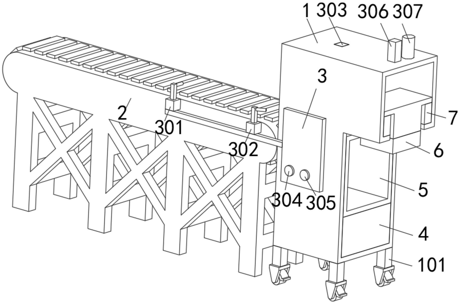 本实用新型涉及木材打孔设备技术领域,且公开了一种木材打孔设备用上料装置,包括上料机主体、流水线装置、顶起装置、推出装置、升降装置、控制系统,流水线装置设置在上料机主体的出料方向,上料机主体的出料方向一侧开设有推出木材的开口,开口最低端与流水线装置的顶面平齐,上料机主体的内部设置有上料框,上料机主体的底部安装有导向轮。该木材打孔设备用上料装置,通过上料机主体内部设置上料框,能够放置木材,通过流水线感应器的输出端与中央处理器的输入端电连接,上料感应器的输出端与中央处理器的输入端电连接,中央处理器的输入端与顶起装置的输入端电连接,中央处理器的输入端与推出装置的输入端电连接,达到了上料自动化。