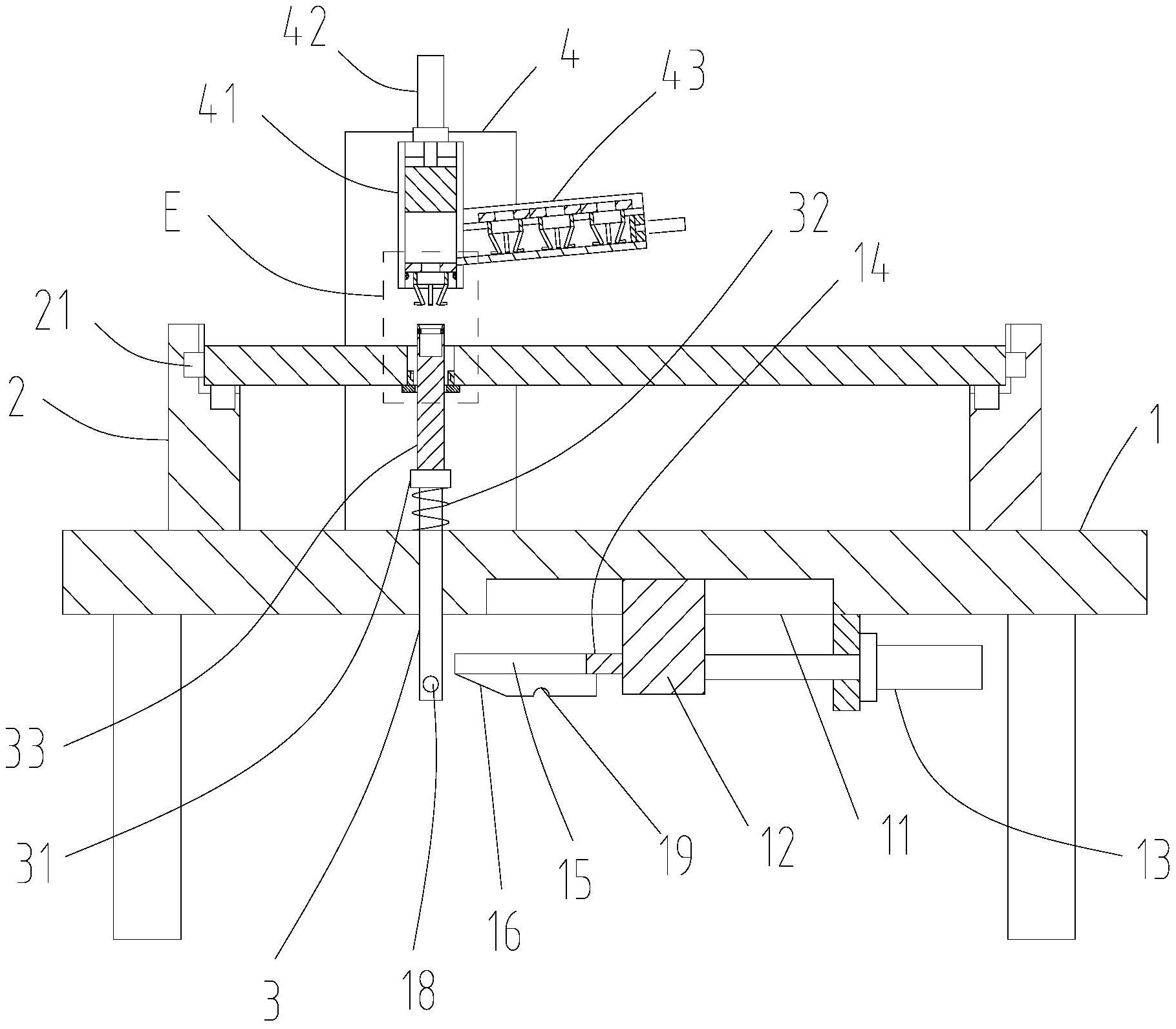 本实用新型公开了一种防盗门装配台,包括工作台,工作台上侧固定连接两个托板,每个托板上端设有直角槽,两个直角槽相对设置,工作台设有滑孔,滑孔内滑动连接拉杆,拉杆上端固定连接圆台,圆台与工作台之间固定连接支撑弹簧,圆台上侧固定连接圆柱,圆柱上端设有圆孔,圆孔上端设有倒角,圆孔内壁设有环状槽,环状槽内固定连接橡胶圈,橡胶圈内壁设有防滑槽,工作台上侧固定连接侧板,侧板固定连接投料管,投料管上端固定连接下压气缸,下压气缸的伸缩杆下端固定连接推块。本实用新型通过拉杆将卡接部下拉,卡接部的弹性卡板弹性复位从而使得卡条快速卡入固定座上,安装快捷方便,工作效率高。