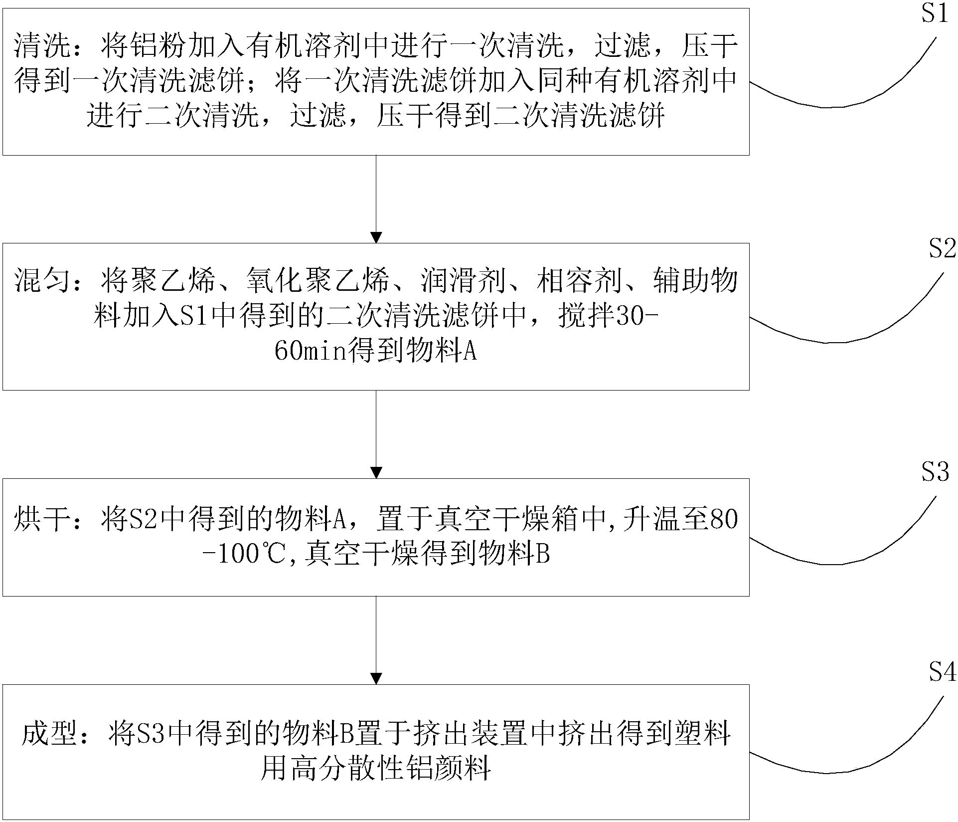 本发明公开了一种塑料用高分散性铝颜料,其原料按重量百分比包括:铝粉75‑85%,聚乙烯7‑11%,氧化聚乙烯4‑6%,润滑剂0.5‑2%,相容剂0.5‑1%,辅助物料3‑5%。本发明还公开了上述塑料用高分散性铝颜料的制备方法,包括如下步骤:S1、清洗;S2、混匀;S3、烘干;S4、成型。本发明与塑料材料相容性好,可以均匀分散在塑料材料中,不易氧化变色,装饰效果好,操作简单,有利于工业化生产。