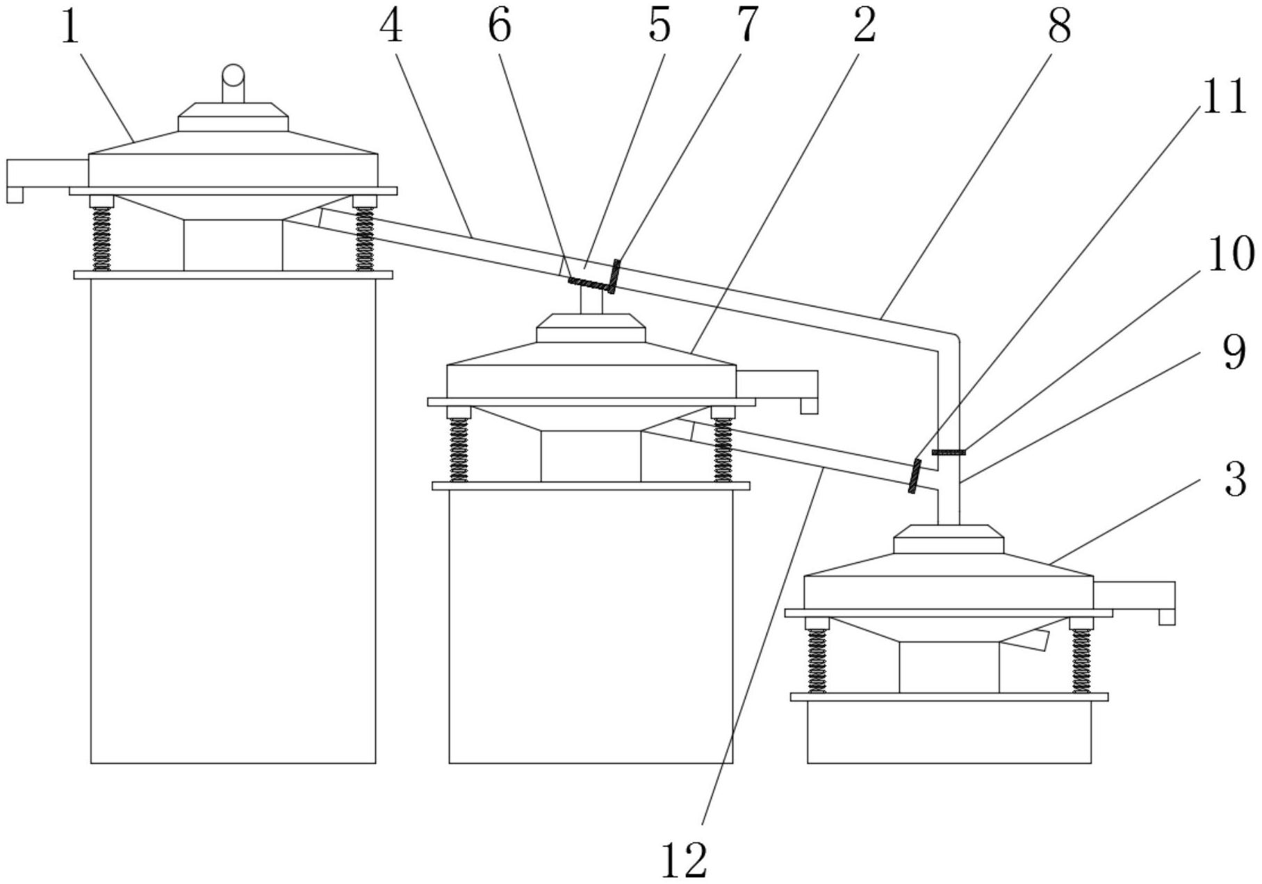 本实用新型涉及一种通过阀门管道控制多级筛分装置,属于化工设备技术领域,包括一级筛分装置、二级筛分装置和三级筛分装置,二级筛分装置的进料位置上端连接有第一三通管,三级筛分装置的进料位置上端连接有第二三通管,第一三通管的一端通过第一软管连接一级筛分装置的出料端,第一三通管的另一端通过第二软管连接第二三通管的一端,第一三通管朝向二级筛分装置的管道内设有第一阀门,第一三通管朝向第二软管的管道内设有第二阀门;本实用新型相比较现有技术,该装置在同类型装置基础上进行优化,扩大其应用领域;同时提高筛分时效率,节约成本;并且设备制作简单、操作方便,运行稳定可靠。