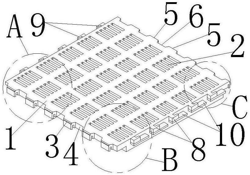 本实用新型公开了一种室内拼接地板,包括地板本体,地板本体上设有若干透热通孔;地板本体的左侧面纵向排列有若干第一突出部分、第一凹槽;地板本体的右侧面纵向排列有、第二突出部分,第二凹槽;各第一突出部分、第二突出部分的底面中部上纵向设有开口向下的连接板卡槽;地板本体的前侧面纵向排列有若干水平截面呈“L”形的第一挂钩,地板本体的后侧面纵向排列有与第一挂钩数量相同的呈“L”形的第二挂钩;各第一挂钩的下方设有顶面为水平面的阻挡块;各阻挡块的底面高于地板本体的底面;地板本体左、右两端纵的厚度均小于其其余部分的厚度。本实用新型地板具有透热效果好,装配工序的简单等特点。