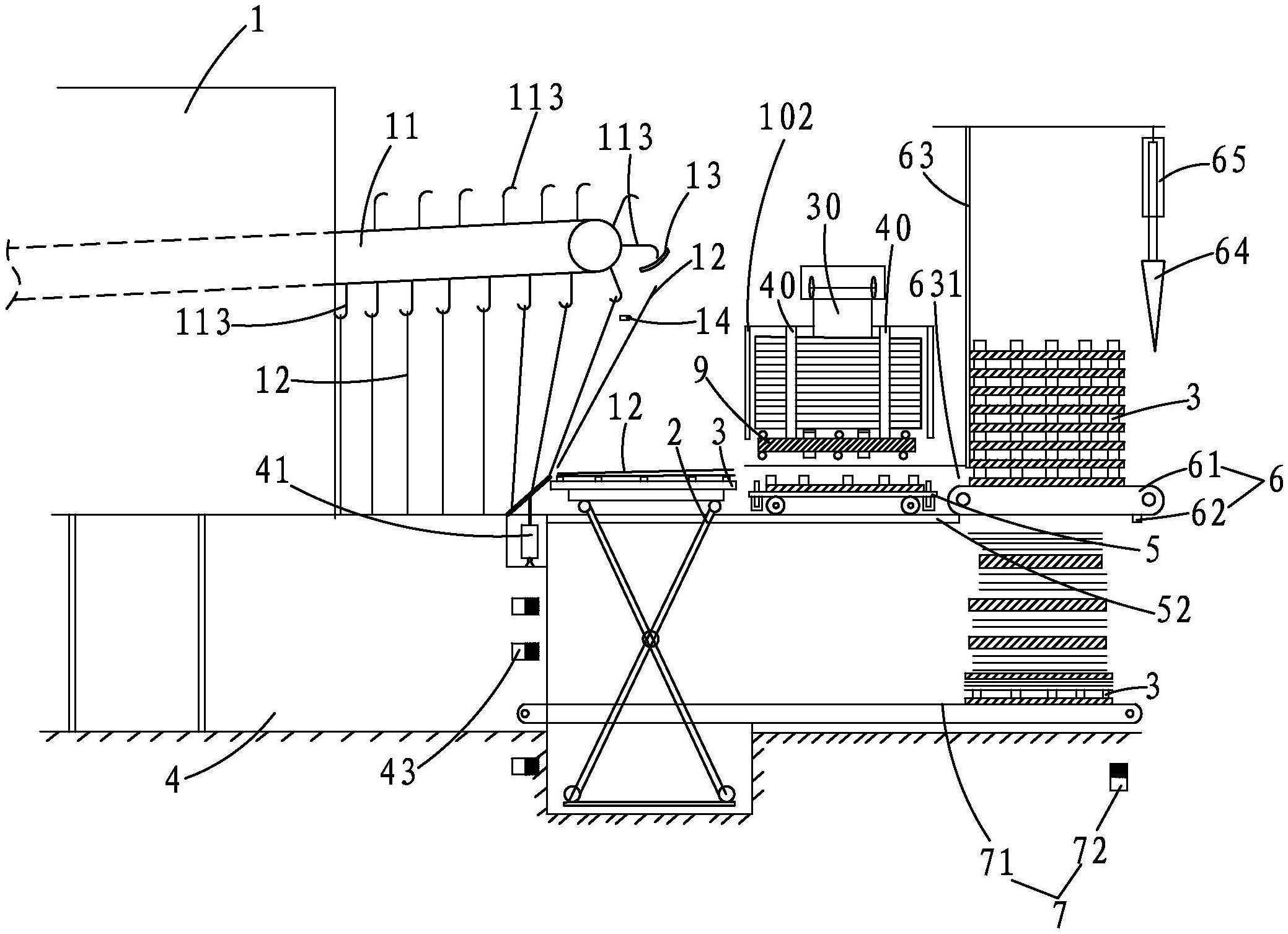 本实用新型提供一种浸胶二次干燥竹帘自动堆垛系统,包括:吊架链式运输机,包括吊钩,吊钩用于吊着浸胶二次干燥竹帘;脱帘横档,固设于吊架链式运输机的出口位置;第一升降机,位于脱帘横档的下方;竹帘堆垛架,能放置于第一升降机的顶部;支撑座,位于吊架链式运输机的下方;阻尼板控制装置,包括阻尼板与第一驱动气缸,第一驱动气缸的伸缩端与阻尼板的下侧面铰接,第一驱动气缸的缸体与支撑座铰接,阻尼板的一端与支撑座铰接。本实用新型的优点在于:吊钩上的浸胶二次干燥竹帘按顺序铺设在竹帘堆垛架上,实现自动化收帘铺放堆垛,减轻人工的劳动强度,减少不必要的材料搬迁和铺装转运工作,使员工只要检查收帘铺放的质量问题,提高生产效率。