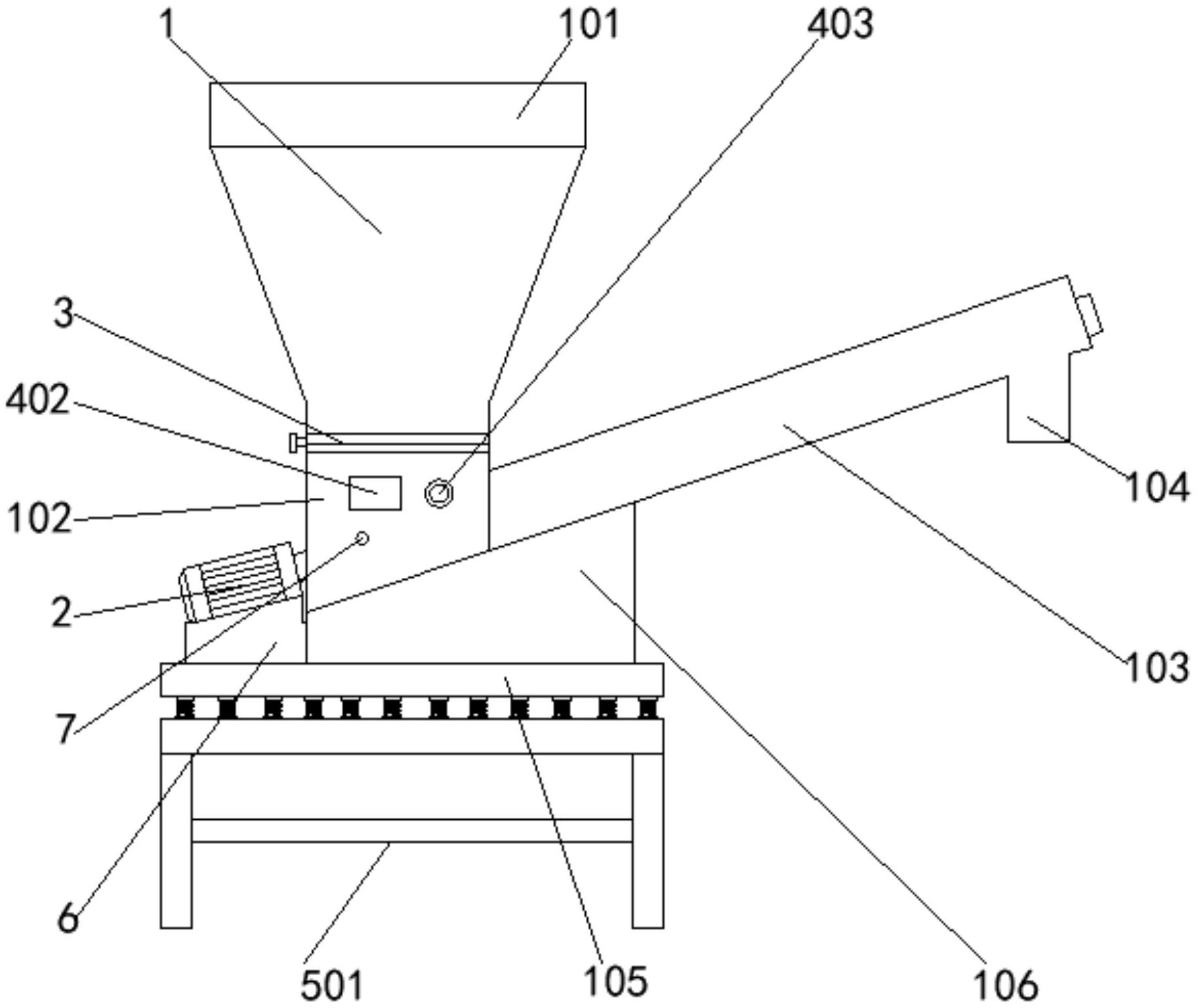本实用新型属于物料运输技术领域,尤其为一种上料储料一体机,包括储料仓体,所述储料仓体的上端面安装有密封盖,所述储料仓体的下端面连通有下料仓,所述下料仓的右侧连通有上料管,所述上料管的下端面右侧连通有出料管,所述下料仓的左侧安装有电机,所述电机的输出端可拆卸连接有螺旋输送轴,所述螺旋输送轴的右端贯穿下料仓并与上料管的内部右侧通过轴承活动连接,所述下料仓的下端面固定连接有支撑固定座,所述支撑固定座的下端面固定连接有安装板,通过将储料仓体和用于上料的上料管结合于一体,进而解决了原先的设备储料与上料为两个单独设备造成占地太大的问题,大大节省了设备所占用的空间。