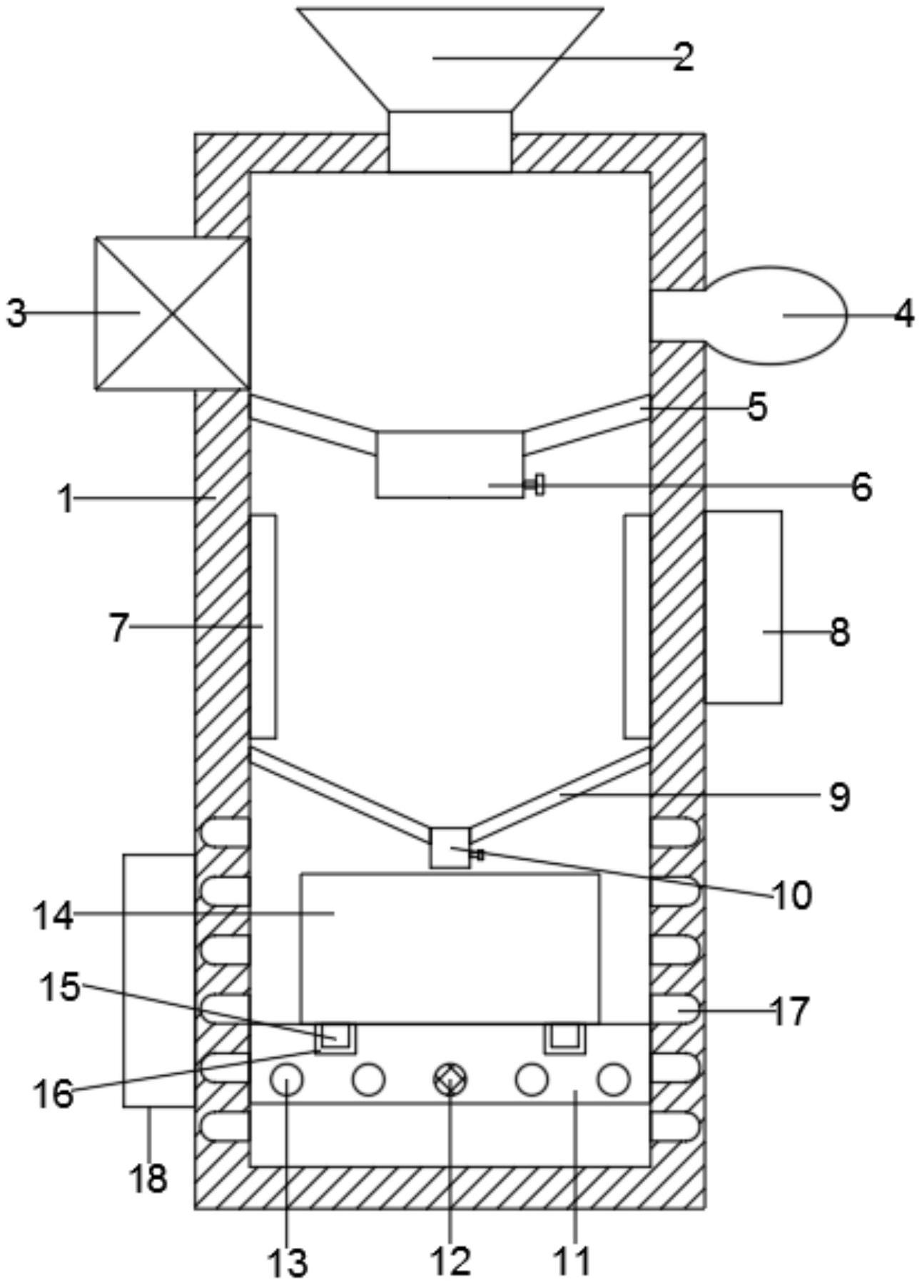 本实用新型公开了一种五金废料集中回收处理装置,包括箱体,箱体顶部固定有进料斗,箱体从上往下依次被上隔板和下隔板分隔为分离室、熔融室和重铸室;分离室一侧固定有风机,另一侧固定有集尘袋,上隔板中间处固定有第一下料管;熔融室内壁固定有一圈加热板,下隔板中间处固定有第二下料管;重铸室一侧通过合页连接取放门,另一侧转动支撑有往复丝杆,重铸室一侧固定有导向杆,往复丝杆和导向杆套设有滑动板,滑动板上端卡接有重铸模具,重铸室安装有冷凝盘管。本实用新型中设置熔融室对废料进行熔融,不浪费资源也不占用额外的存储空间;在进行熔融前,对废料中的灰尘进行分离,使得熔融的液态废料减少灰尘杂质含量。