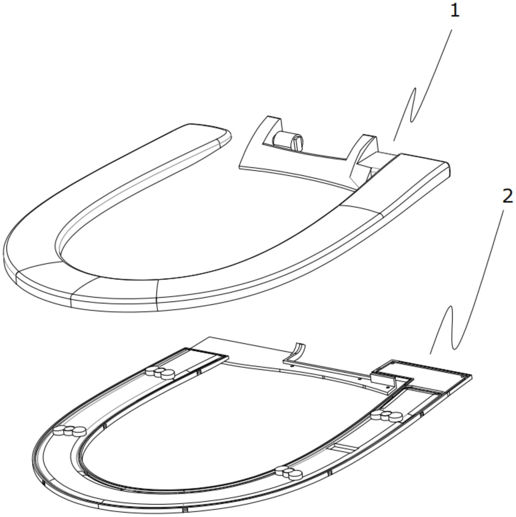 本实用新型公开了一种换膜座圈及其智能马桶,座圈本体包括:座圈上盖,座圈上盖包括一体成型的座体以及第一U型圈,第一U型圈的一端与座体连通,第一U型圈的另一端与座体分体设置,座体远离第一U型圈的弧顶点的一侧开设安装槽,座体与第一U型圈相连接的一侧的槽壁上设置有转轴,转轴上沿轴向开设有贯通座体的过线孔,安装槽远离转轴一侧的槽壁上设置有阻尼器,座圈上盖通过转轴以及阻尼器转动设置于基座上;座圈下盖,固设于座圈上盖的下端表面,座圈下盖包括与第一U型圈适配的第二U型圈,第二U型圈在与第一U型圈及座体连接的部位相应位置处向下一体成型连接有底板座;加热装置的加热导线通过过线孔伸入座圈本体内。