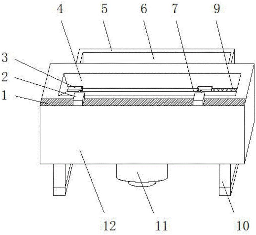 本实用新型公开了一种快速检测食品包装袋封口密封性的设备,包括机身,所述机身的底端两侧焊接有支撑板,所述机身的底端中通过螺钉固定连接有吹气装置,所述机身的顶端表面一侧设置有滑轨,所述滑轨的两端滑动连接有导向块。该种实用新型设计合理,使用方便,通过设置有置物槽、袋口槽和吹气装置,方便通过将食品包装袋放置在置物槽内部,便于食品包装袋的一端塞入袋口槽内部,通过吹气装置往食品包装袋的袋口处进行吹气,便于检测袋口处的密闭性,通过设置有密封移板、滑轨和导向块,方便通过导向块在滑轨上移动从而使密封移板移动,便于根据食品包装袋袋口的大小改变袋口槽的大小,该实用新型简单方便,适合广泛推广。
