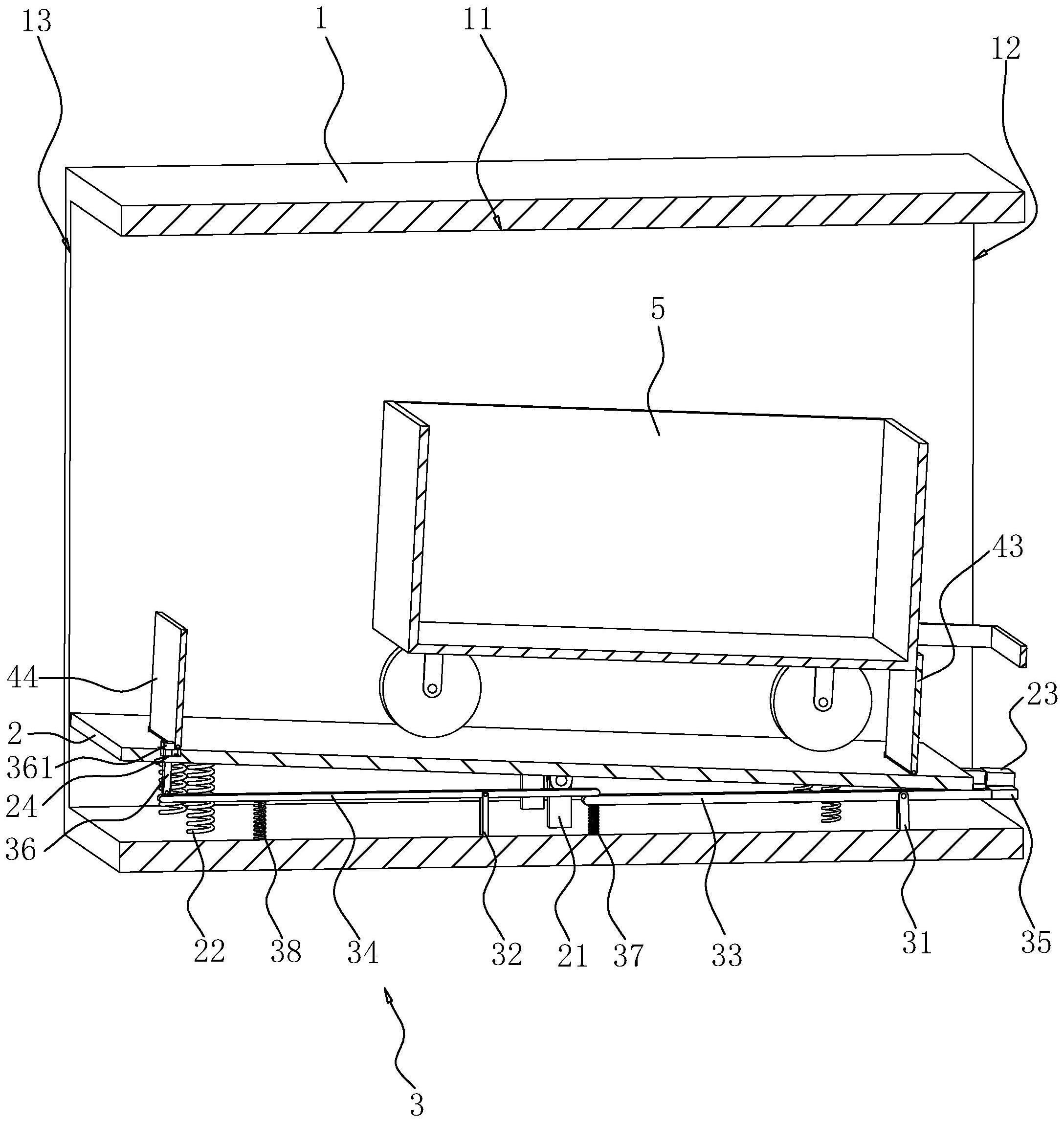 本申请涉及一种蒸柜及使用该蒸柜的五谷杂粮包的制作方法,涉及面点加工的领域,包括柜本体,柜本体内设有用于置放推车的腔室,腔室的一侧贯通柜本体并形成出口,所述腔室内设有底板,底板与腔室的内底壁之间设有至少一个支撑杆,支撑杆的下端与腔室的内底壁固定连接,上端与底板的中部铰接,底板与腔室的内底壁之间固定连接有多个支撑弹簧,底板上连接有调节底板沿靠近出口的方向逐渐向下倾斜的调节机构。本申请具有减少工作人员被推车烫伤可能性的效果。