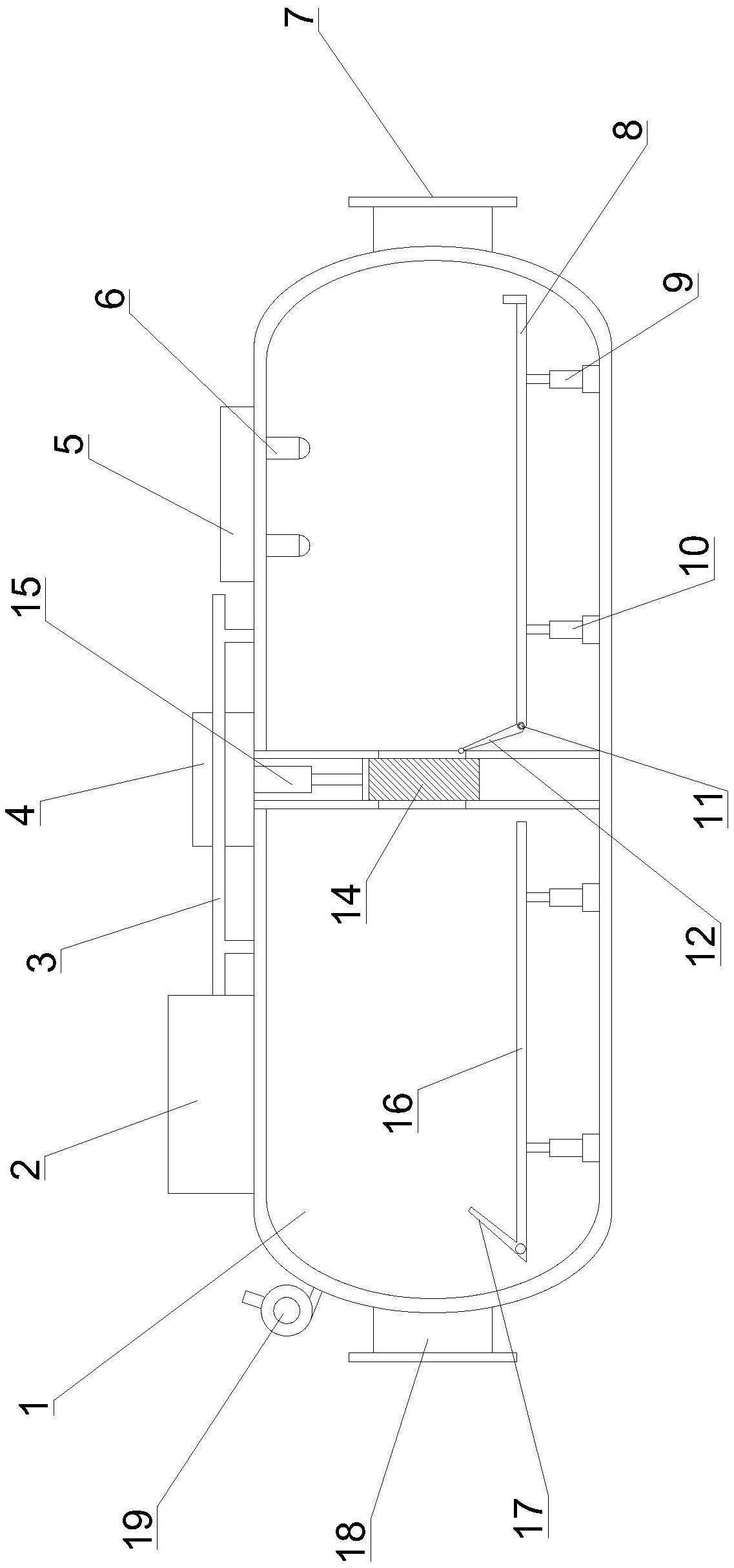 一种反压微波灭菌干燥装置,包括密封罐、增压装置、驱动装置、微波控制器、第一支架和第二支架;密封罐的中部设置有阻隔件,阻隔件将密封罐的内部分隔成灭菌仓和干燥仓;驱动装置设置在密封罐的外部,阻隔件的中空部内设置有升降杆;升降杆的底部设置有闸板,闸板与阻隔件中部的开口配合形成密封结构;微波控制器设置在密封罐的外部,灭菌仓的内部设置有微波发生器;微波发生器竖直向下发射微波;增压装置设置在密封罐的外部,增压装置上设置有输气管;第一支架设置在灭菌仓内,第一支架朝向阻隔件的一侧设置有斜板,斜板与第一支架的连接处设置有转轴,斜板绕着转轴转动;本实用新型密封罐两侧独立工作,互不干扰有利于提高生产效率。