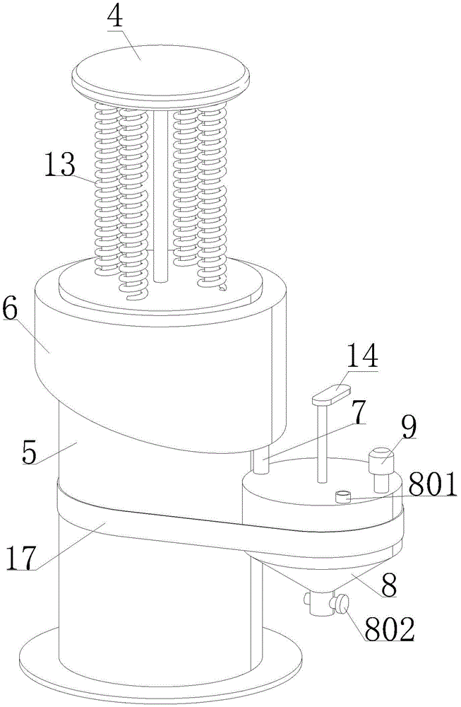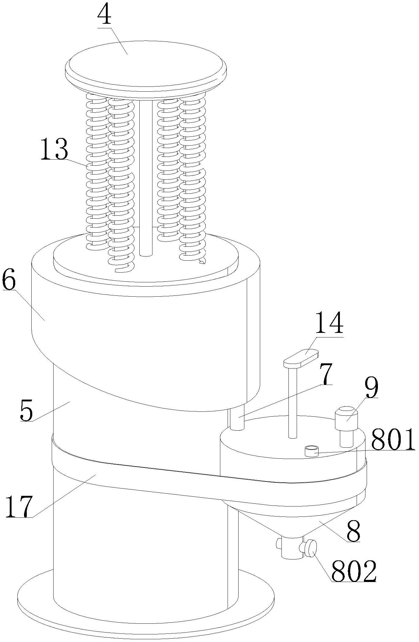 一种用于食品检测的金属检测装置,包括第一滑台、第二滑台、第一弹性件、顶板、取样筒、导料筒、连通管、收集箱、检测棒、挡台、连接件和连接杆;第一滑台和第二滑台均为回转形凸台结构,第一滑台和第二滑台同轴设置,第二滑台位于第一滑台内侧,第二滑台与第一滑台滑动连接,第一滑台与取样筒滑动连接;第二滑台、连接杆和顶板由下至上依次连接;挡台设置在取样筒内表面上;取样筒上设置有第一通孔;导料筒设置在取样筒外周面上,导料筒上设置有与第一通孔连通的第二通孔;连通管两端分别与导料筒和收集箱连通;检测棒设置在收集箱上。本实用新型能便捷、干净地进行食品样品的取样,将样品与溶液混合,并利用检测棒进行检测,检测结果更准确。