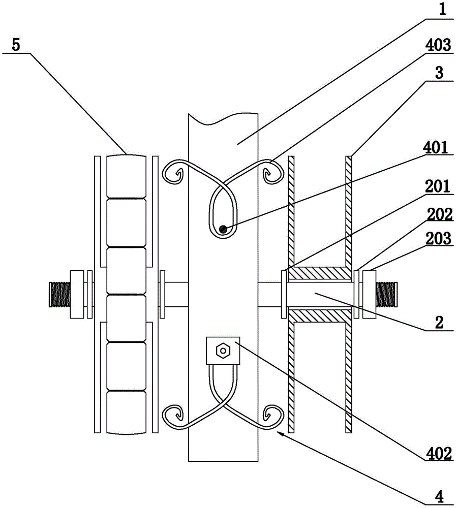 本实用新型涉及一种放置脱氧剂包的轮盘,包括轮盘轴以及可转动的设于所述轮盘轴的轮盘;放置脱氧剂包的所述轮盘通过支撑杆安装于包装机上,两所述轮盘竖直的,并且同轴的安装于所述支撑杆的左右两侧;于所述支撑杆的前端面或者后端面还设有弹力限位件,所述弹力限位件的两端与所述两轮盘的内侧面的间距小于0.5cm;所述弹力限位件为一根金属条经扭转交叉后形成的具有弹力的元件,所述弹力限位件通过固定板固定于所述支撑杆;本实用新型提供的一种放置脱氧剂包的轮盘,与现有技术相比,其设置有弹力限位件,所述弹力限位件能够从所述轮盘的内侧抵住所述轮盘,防止轮盘在放料的过程中左右摆动。