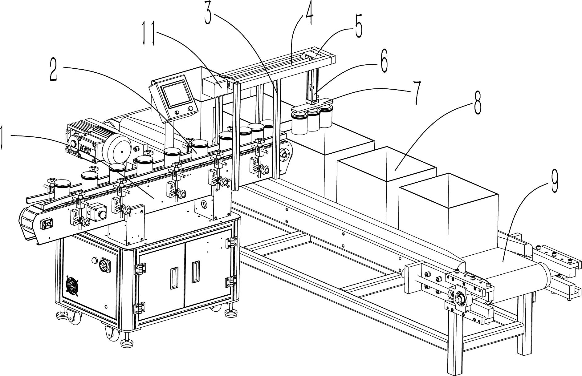 爆米花用罐子自动理瓶装置,包括第一输送机构,第一输送机构一侧设有第二输送机构,第一输送机构上设有支撑架,支撑架上设有滑动的吸盘,罐子堆集抵靠在第一输送机构的端部,吸盘抵靠在罐子的端部,第二输送机构上设有移动的箱子;吸盘吸附罐子将罐子从第一输送机构上移动至箱子内。灌装封装完成的爆米花罐子通过第一输送机构运输抵靠堆集在端部,驱动丝杆带动滑动座和吸盘左右移动,顶推机构驱动吸盘上下移动,多个吸盘吸附在罐子上,移动至第二输送机构上的箱子内,然后释放罐子,使得罐子摆放在箱子内,实现自动理瓶,自动摆放装箱,大大提高了罐子整理装箱的效率,适合推广使用。