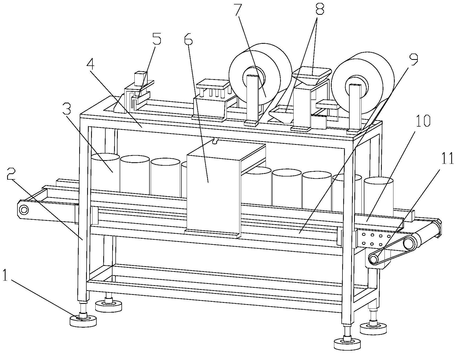 本实用新型公开了一种炒货包装袋全自动给袋式包装机的自动下料机构,其结构包括反震脚垫、支撑框架、下料罐筒、自动包袋台、切刀器、温测感应机构、封袋膜轮、锥形入料口、传送带、限位防护板、驱动皮带轮,反震脚垫上端与支撑框架下端相焊接,本实用新型一种炒货包装袋全自动给袋式包装机的自动下料机构,结构上放置在传送带上的下料罐筒内的物料通过温测感应机构下端,通过温测感应机构内部设置的温感探头进行对下料罐筒内的物料进行温度监测,当温度较低时上端连接的电感处理器会进行感应处理从而发出导电信号让第一导电线进行通电,进一步的让导电管杆内的电力传输到右端连接的电磁块进行通电产生电磁力。