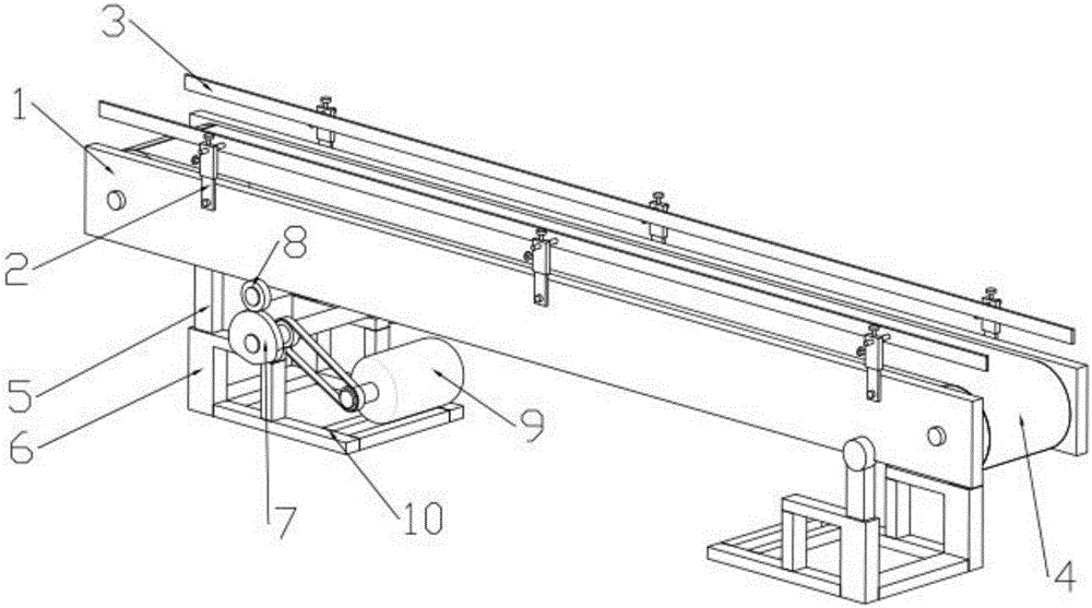 本实用新型公开了一种自动化粉料包装振动输送装置,它属于粉料输送设备技术领域,包括输送带,所述输送带两侧设有平行相对的防护板,所述输送带两端通过轴承连接于防护板上,每一块所述防护板上固定连接有若干个连杆,所述连杆上端通过螺栓连接有挡板,所述螺栓调整挡板水平方向的位置;所述输送带一端下方设有底座,所述底座上设有下支杆,所述下支杆设为空腔,所述防护板底部设有与所述下支杆导向连接的上支杆,所述底座还设有驱动装置,所述驱动装置通过传动装置连接有凸轮,所述凸轮上方设有与凸轮接触的滚轮,所述滚轮通过轴承连接于防护板下面,所述输送带的另一端铰接连接有底座支撑;实现了粉料包装的自动化夯实输送。