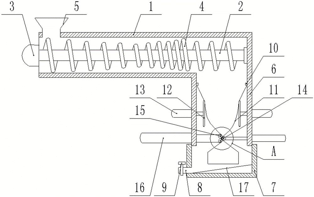 本实用新型是一种降低油料损耗的食品车间用榨油机,包括卧式榨油筒,卧式榨油筒外壁上设有加热套,卧式榨油筒内设有螺旋榨油输送轴,螺旋榨油输送轴连有旋转电机,螺旋榨油输送轴上设有螺旋桨叶,卧式榨油筒顶部一端设有进料斗且底部另外一端设有竖直向下设置的出料筒,出料筒底部连接有接收斗,接收斗一端设有出油口,出料筒内壁上设有环形支架,环形支架底部固定有底部开口的挤压网袋,出料筒内在挤压网袋两侧设有挤压板,挤压板连有挤压气缸,出料筒内底部在挤压网袋右侧设有一个右夹紧辊且左侧设有上下布置的两个左夹紧辊,右夹紧辊以及两个左夹紧辊均连有夹紧气缸。本实用新型充分将油分挤出,降低了油料的损耗。
