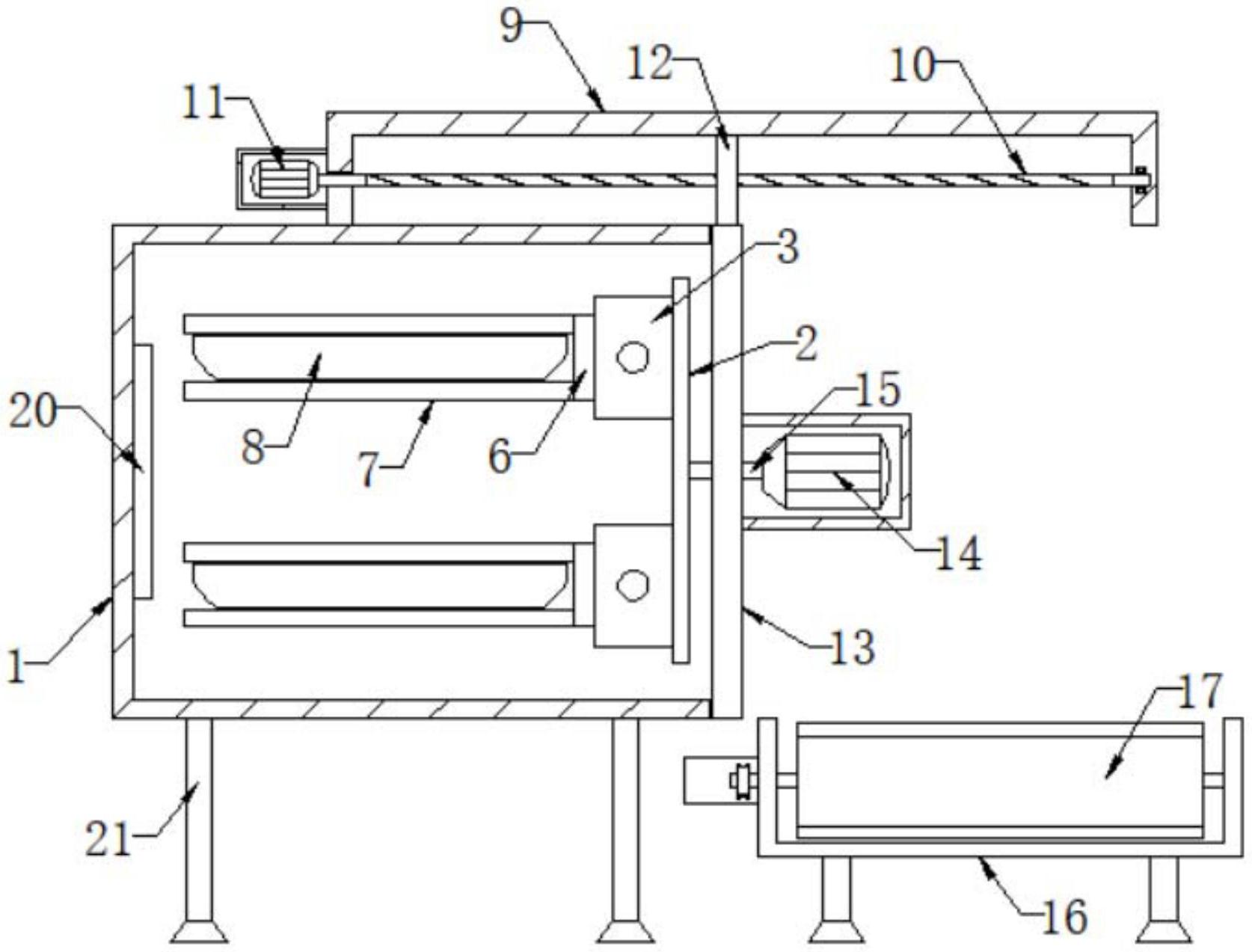 本实用新型公开的属于月饼加工生产技术领域,具体为一种月饼生产用烤盘翻盘装置,包括烤箱,所述烤箱内部的右端纵向设置有调节板,所述调节板的左侧壁固定设置有对称的条形板,两个所述条形板的前侧壁均开设有条形槽,所述条形槽的内部转动设置有双向丝杆,所述双向丝杆的右端贯穿条形板的右侧壁延伸至条形板的右端并固定设置有旋转块,所述双向丝杆的杆壁螺纹连接有对称的滑块,两个所述滑块的左侧壁均固定设置有对称的夹板,两个所述夹板之间横向设置有烤盘,便于对不同大小的烤盘均可以夹持固定,从而在月饼烘烤完成之后,方便对烤盘进行旋转,对内部的月饼进行倾倒,操作方便,减轻人工,生产效率大大提高。