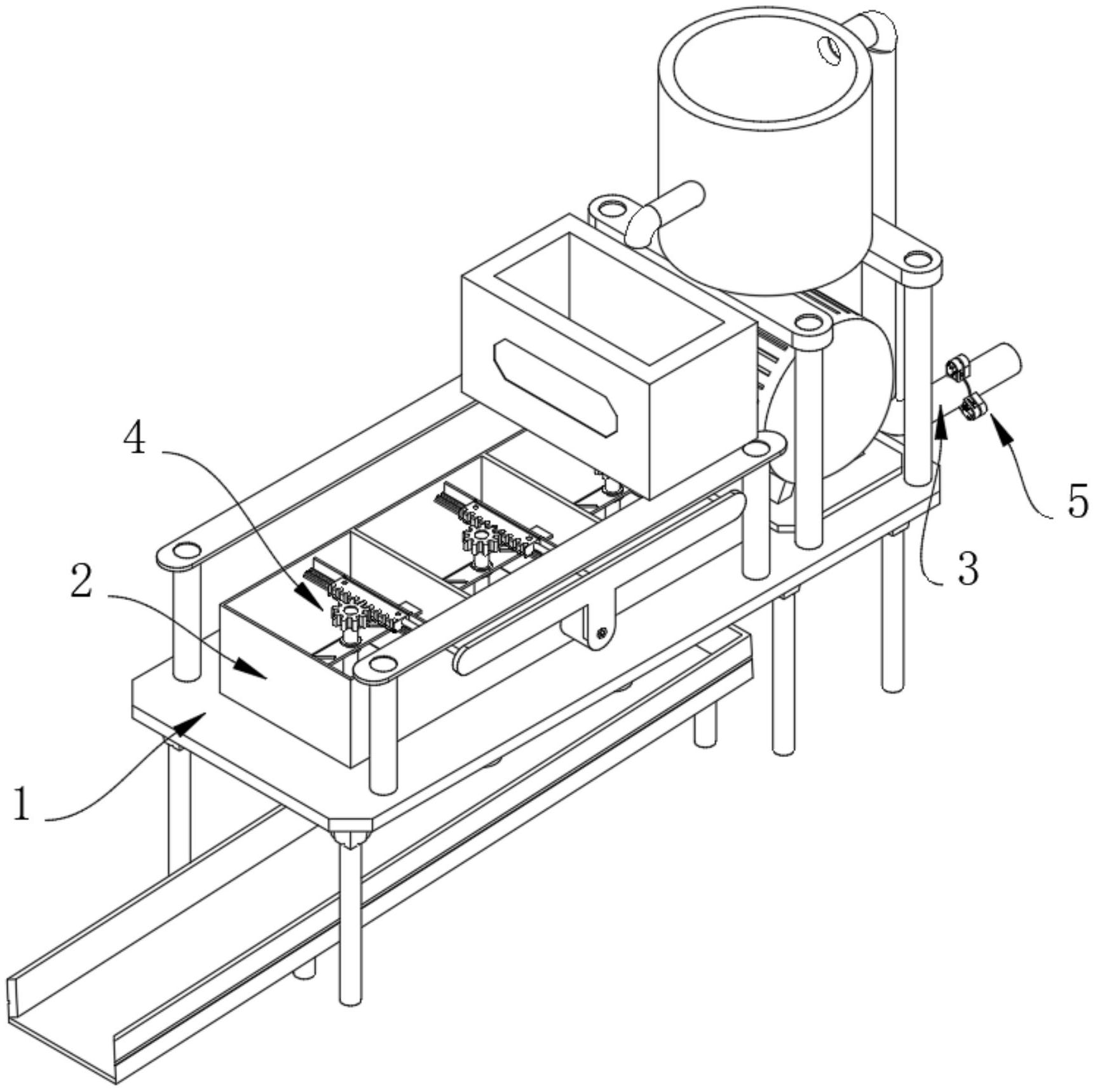 本实用新型公开了一种自动计量自动喂料泡豆装置,具体涉及泡豆领域,本实用新型包括泡豆装置本体,所述泡豆装置本体的内部固定连接有泡豆池,所述泡豆池的内部设有搅拌装置,所述搅拌装置包括限位块,所述限位块的两端与泡豆池固定连接,所述限位块的表面滑动连接有齿条,所述齿条的齿面啮合有齿轮,所述齿轮的下表面固定连接有限位杆,所述限位杆的圆弧面转动连接有两个固定板,所述固定板的两端与泡豆池固定连接,所述限位杆远离齿轮的一端固定连接有搅拌架,本实用新型达到了使操作人员可以通过搅拌架将泡豆池内的豆子进行搅拌,使之更加充分地进行泡豆,从而在一定程度上提高自动喂料泡豆装置的泡豆质量的目的。