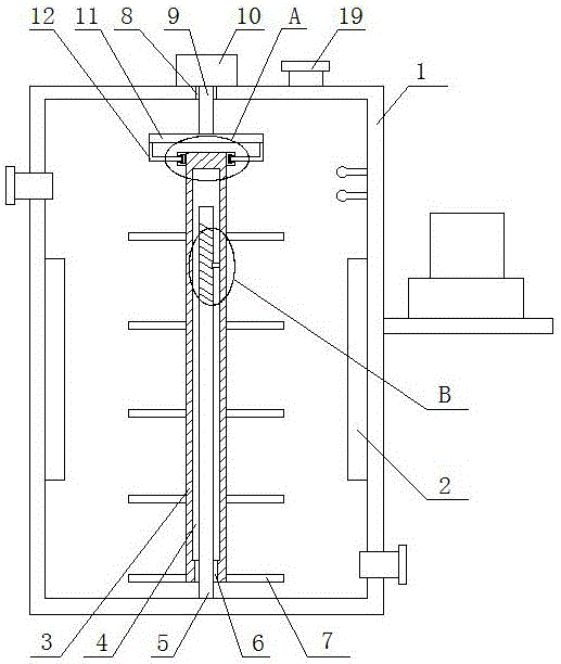 本实用新型属于微生物培养技术领域,尤其是一种用于食品安全检测的微生物培养装置,针对现有的微生物培养装置使用多台电机用于对微生物原料的充分搅拌,装置成本造价较高,且搅拌叶始终沿着同一方向进行旋转,微生物培养液与物料难以混合均匀,不利于微生物生长的缺点,而提出如下方案,其包括装置主体,装置主体的两侧内壁上均固定安装有照射灯,所述装置主体内设有搅拌杆,搅拌杆的两侧均固定安装有多个搅拌叶。本实用新型结构简单,只使用一个伸缩液压缸即可实现,降低了装置的造价成本,多个搅拌叶上下移动的同时转动,对微生物培养液多层次多方向进行搅拌,使得培养液与物料快速充分的混合,提高了混合速率。