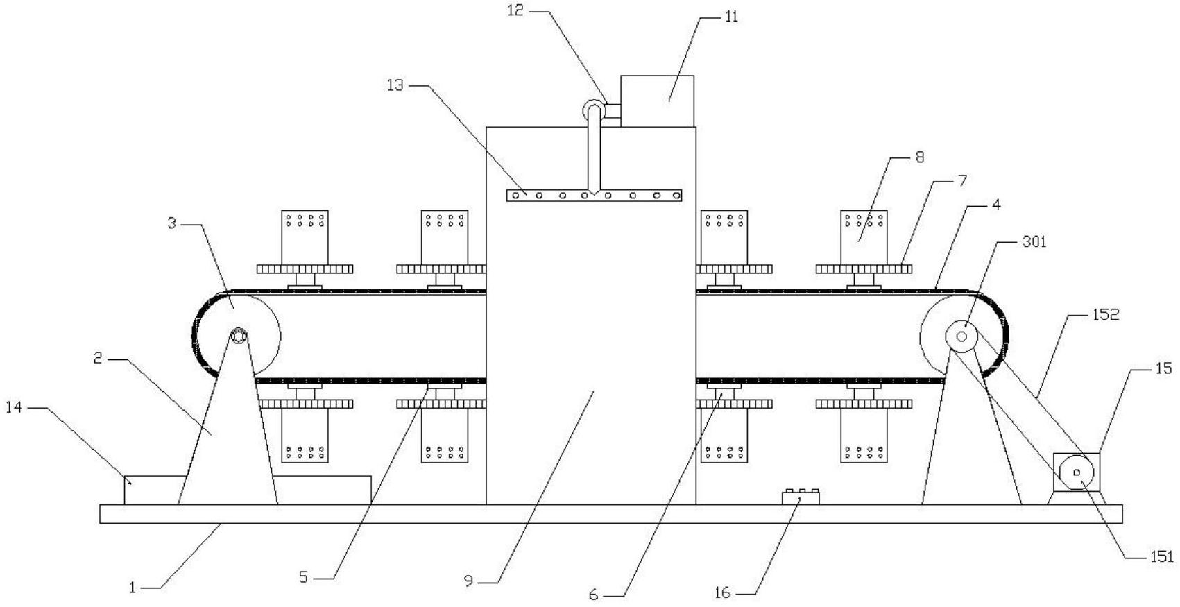 本实用新型公布了一种功能饮料表面除水装置,包括基座,基座的顶部左右两侧连接有固定架,固定架的上端安装有传动辊,两组传动辊的外壁之间套设有输送带,输送带的外表面连接有若干组轴承座,轴承座内转动连接有固定轴,固定轴的上端连接有传动齿轮,传动齿轮的顶部中心处连接有放置座,基座的顶部中段连接有U型座,输送带贯穿U型座开口,本实用新型结构设计合理,能够对瓶身进行全面风干,有效除去瓶身的残余水珠,便于后序加工的进行,放置座运转至左侧传动辊下方时,承接槽内水滴落入接水槽,便于收集处理。